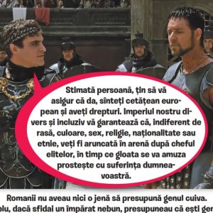 – Prieteni, britoni, concetățeni, ascultați-mă! Trebuie să ne revoltăm contra Romei! – De ce? – Pentru că vor să ne umple insula cu imigranți ilegali aduși să sclavagească! – Wow, vor să ne aducă Glovo? Asta înseamnă că ne bagă și Internet, să putem juca la păcănele direct din casă? – Atunci… să ne revoltăm pentru că romanii plănuiesc să submineze familia tradițională! – Cum? – Prin civilizație! – Vai, nu! Adică nu înțeleg. – De exemplu, vor face drumuri. […]