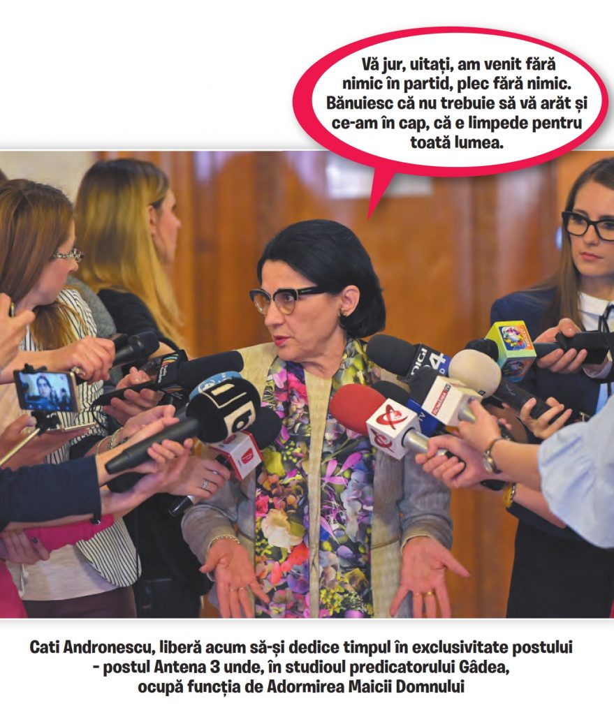 Și-acum să titrăm: ”Atomica de la Cati Andronescu!”. Femeia a zis că ea a candidat acum pentru funcția de președinte executiv al PSD ca să dea o speranță tinerilor din România. O speranță că ce? O speranță că și cel mai habarnist dintre habarniști poate, gângurind locuri comune, să ajungă și să stea ani buni la vârful celui mai mare partid?