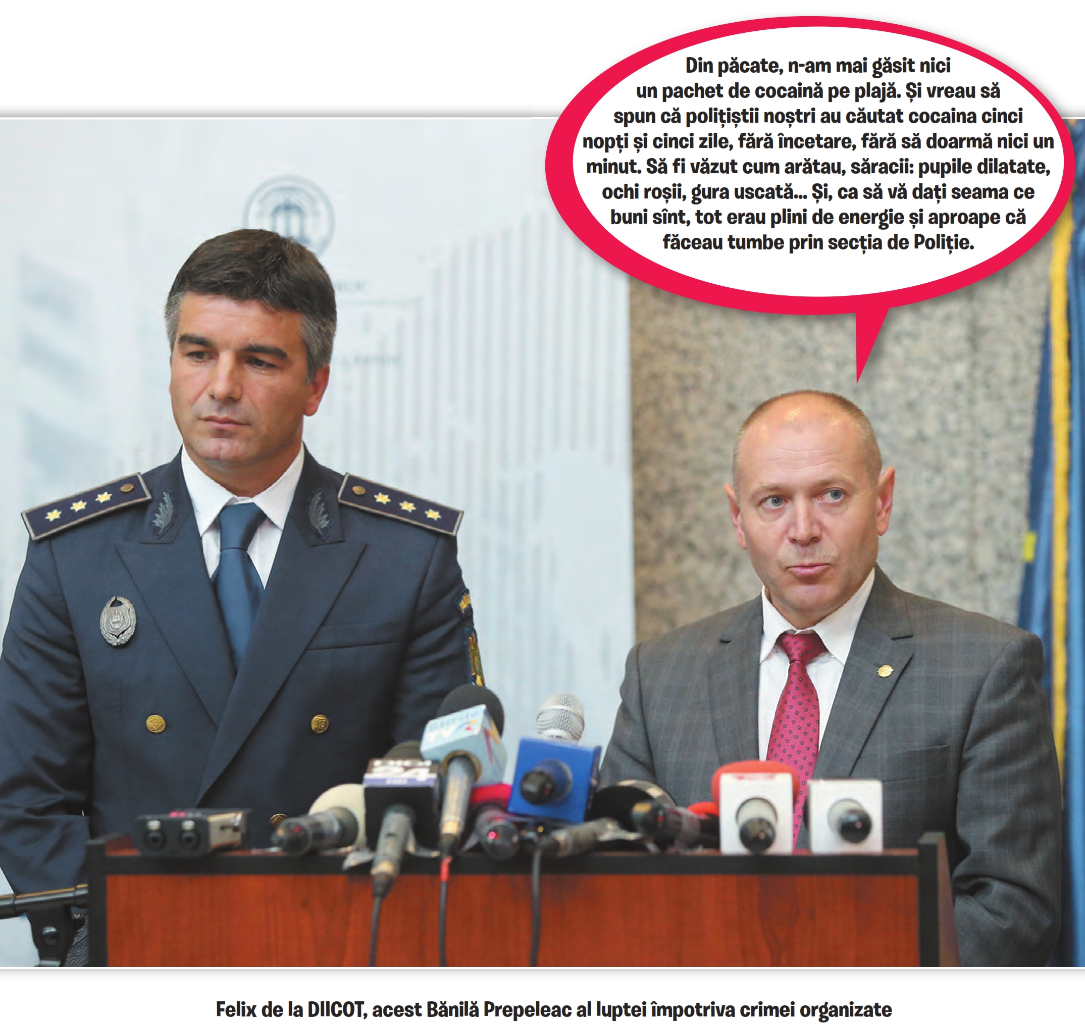 Din 26 martie încoace, piața informațională a micuței noastre patrii este inundată de știri despre droguri de mare risc. Atunci, pe 26 martie, DIICOT a ieșit oficial la rampă, prezentând uniformele mai vechi ale mascaților, armele din dotare și o impresionantă captură de droguri, cea mai mare din ultimii ani: 1.040 de kilograme de cocaină. Mândru ca un păun, Felix Bănilă, procurorul-șef al DIICOT, a declarat în fața presei din București: „În seara zilei de miercuri, 20 martie, în judeţul Tulcea, dintr-o dubă înmatriculată în România a fost pierdut un pachet cu un kilogram de cocaină. Analiza fizico-chimică realizată într-un laborator din Constanţa a arătat că puritatea narcoticului era de 90 la sută“. Acesta ar fi fost, spune Bănilă, începutul unei ample anchete, care a dus la descoperirea, pe plaja din Sfântu Gheorghe-Tulcea, a unei bărci răsturnate, din al cărei fund dublu au fost extrase pachetele însumând peste o tonă de cocaină.