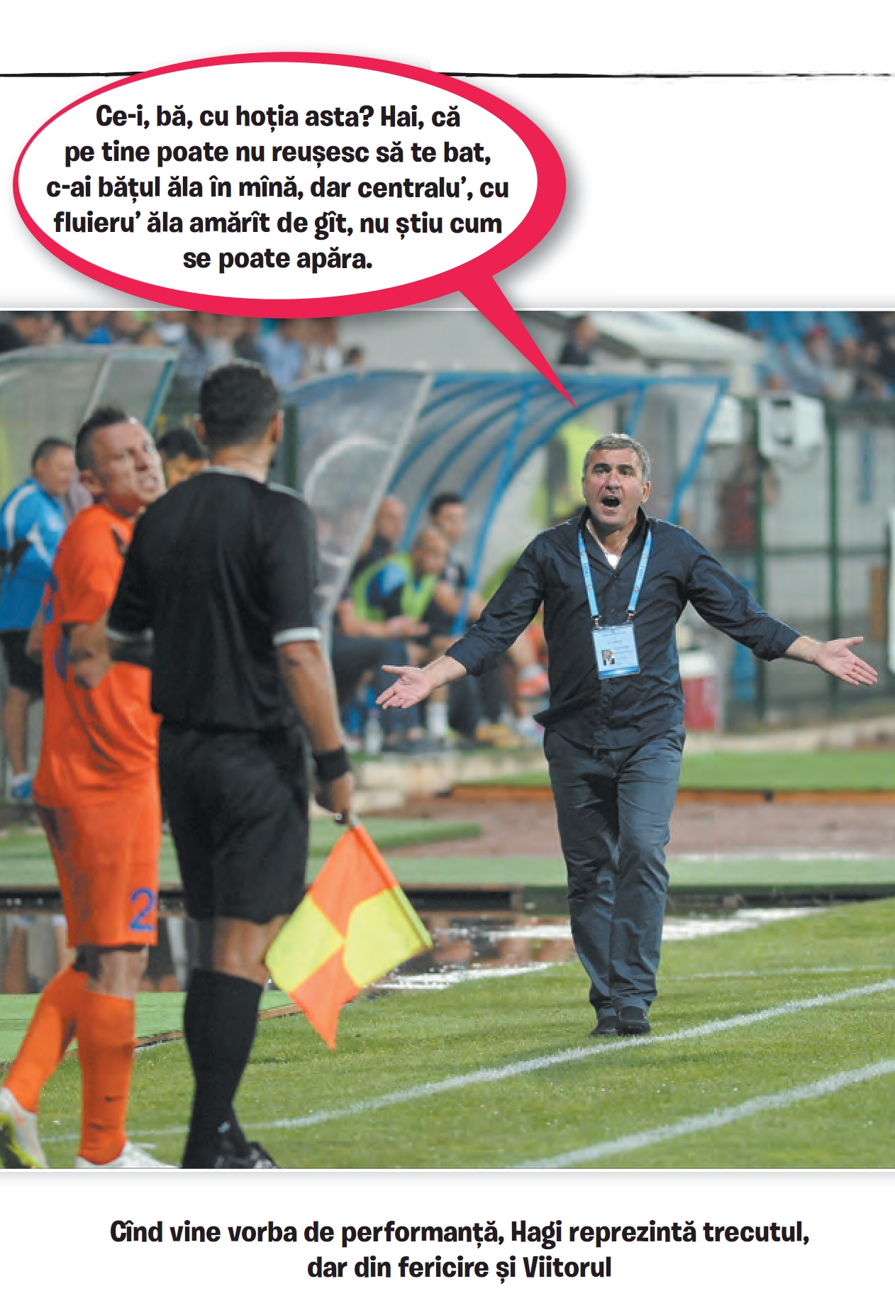 Un chibiț totalmente lipsit de prejudecăți se întreba în marțea lîncezelii noastre, de după meciul cu de-alde Mitroglu, de ce nu l-o fi adus Iordănescu pe Gică Hagi, pe bancă, printre rezerve, în așteptarea vreunei lovituri de la 16 metri, dacă tot n-avem pe altcineva s-o execute, nu să-și încerce norocul. Omul are dreptate. Hagi și-acum trimite mingea în poartă, cînd le arată puștilor de la Viitorul de ce loviturilor ăstora li se zice jumătăți de penaltiuri, în timp ce Keșeru și Sânmărtean au încercat să ne demonstreze că sînt niște pase pentru publicul de la peluză.