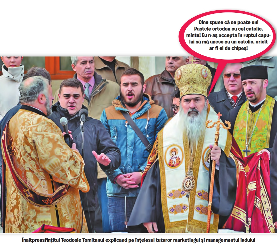 În sfârșit, și o veste bună: BOR se luptă cu turnătorul Mache Teodosie. Minune pascală, nu alta. Căci de la Lumina Sfântă s-au luat Mache și purtătorul de cuvânt lumesc Bănescu, dacă întrerupătorul e la ortodocși sau la catolici și cum ar trebui plătită factura. Teologic vorbind, mă doare-n fund, să facă ce vor, să se unească abuzatorii de copii cu abuzatorii de băieți, să strângă bani de la săraci prin frică împreună. Dar ce bucurie mai mare, Doamne, decât să vezi turnătorul ținut în funcție de BOR cum face pipi pe BOR! Minciuna și prostia în acțiune, fățărnicia și pidosnicismul, mizeria ascunsă mereu sub preș transformată acum în bombă și nu alta. Iată ce scrie Teo despre Bănescu (e cancan, Click! pentru proști, bârfă și venin, râsuri de oameni): „Este un om vrednic de compătimire, care are nevoie de rugăciune. El nu se roagă, de aceea vorbește chiar împotriva Bisericii, nu reprezintă Biserica și îmi pare rău. Într-o vreme venea foarte des la noi, la simpozioane, și arăta foarte familiar, așa a fost și în facultate. Cred că este un accident în viața lui, în mintea lui. Are a doua soție care a fost categoric împotriva religiei și atunci ce să aștepți dintr-o atmosferă de familie foarte controversată? Dumnezeu să-l ajute, ne rugăm pentru el“. Adevăr vă grăiesc vouă, îi calcă Daniel cu BMW-ul.