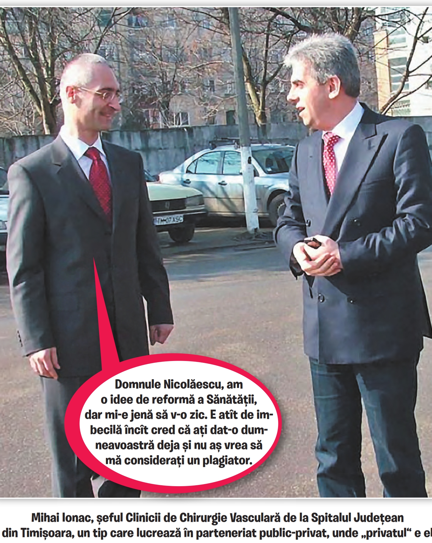 n-a umplut doar conturile farmaciei de familie, ci și pe cele ale asociației al cărei factotum este, CompasX. Sub pretextul – nobil, de altfel – că dorește să renoveze clinica, lucru care s-a și întîmplat, grație sponsorizărilor generoase făcute de diverse firme potente din oraș, acesta le solicita direct pacienților să facă donații în contul asociației! Și, ca să fie sigur că nu rămîne cu buzele umflate, precautul doctor Ionac încasa mereu banii în ziua internării, un detaliu care demonstrează că bieții pacienți n-au avut încotro, iar “donațiile” numai acte benevole nu au fost… Placa cu donațiile le-a fost servită îndeosebi pacientelor care se prezentau la Clinica de Chirurgie Vasculară pentru operații de dezlegare a trompelor uterine, paciente vulnerabile și convinse că trebuie să facă orice pentru a le fi redată șansa de a naște în viitor. O astfel de pacientă a primit următorul răspuns din partea profesorului Ionac, în momentul în care l-a întrebat despre costurile operației: “Relativ la costurile materialelor pe care trebuie să le folosim la operație, ele vor fi acoperite dacă veți avea amabilitatea de a dona în contul fundației secției noastre suma de 5.000 de lei”! Așadar, imaculatul doctor Ionac raportează, la Casa de Asigurări, operația de dezlegare a trompelor uterine ca făcînd parte din Programul Național de Sănătate pentru Boli Cardiovasculare (un alt aspect ilegal semnalat de auditorii Camerei de Conturi Timiș), din care se decontează spitalului consumul de materiale sanitare folosite în cursul intervenției chirurgicale, iar pacienta – care în acest caz n-ar trebui să plătească nimic, din moment ce toate materialele sînt plătite de stat – este rugată frumos să scoată din buzunar suma rotundă de 5.000 de lei, cică pe post de donație… Neavînd încotro, femeia s-a conformat și a “donat”, dar ne punem și noi o întrebare: dacă “n-ar fi avut amabilitatea”, ați mai fi operat-o, dom’ profesor?