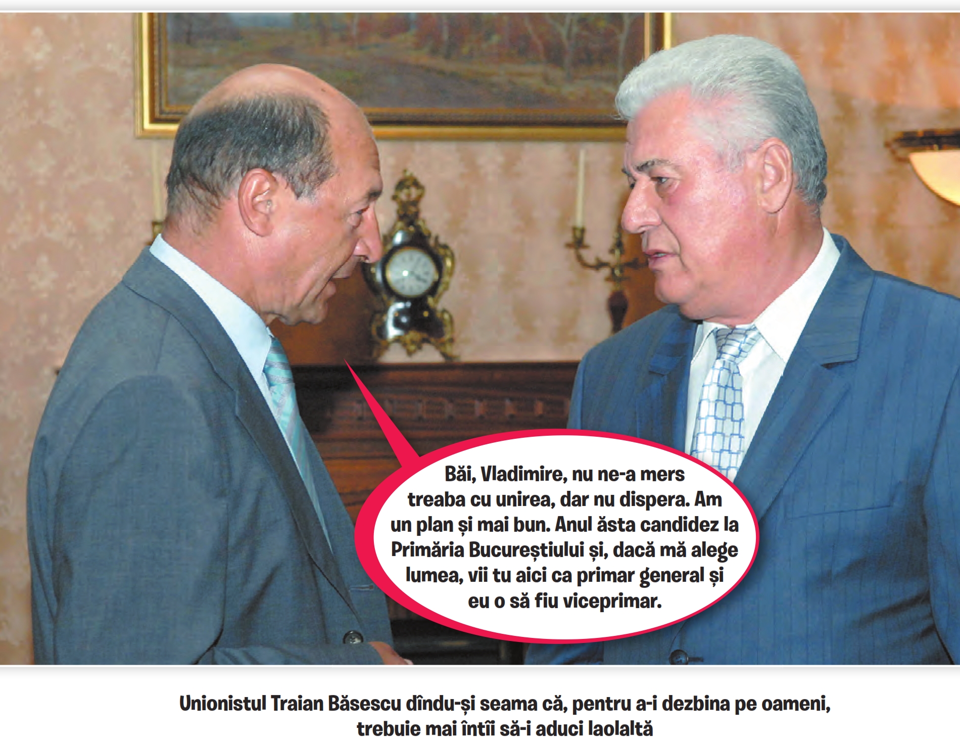 Potrivit fostului șef de stat, au existat discuții avansate cu trompetele lui Felix, care au acceptat să-l ia la țintă pe Voronin. Negocierile au ajuns însă într-un impas atunci când mercenarii securistului de la Grivco au spus că e prea mult pentru ei să dea și în Băsescu, și în liderul de la Chișinău, și au cerut să renunțe la emisiunile antibăsiste. Președintele nici n-a vrut să audă și așa a picat varianta unirii cu Moldova. Iată cum pornirile lui Băsescu de a controla presa și de a se afla mereu în centrul atenției au dus la nerealizarea visului de secole al românilor.