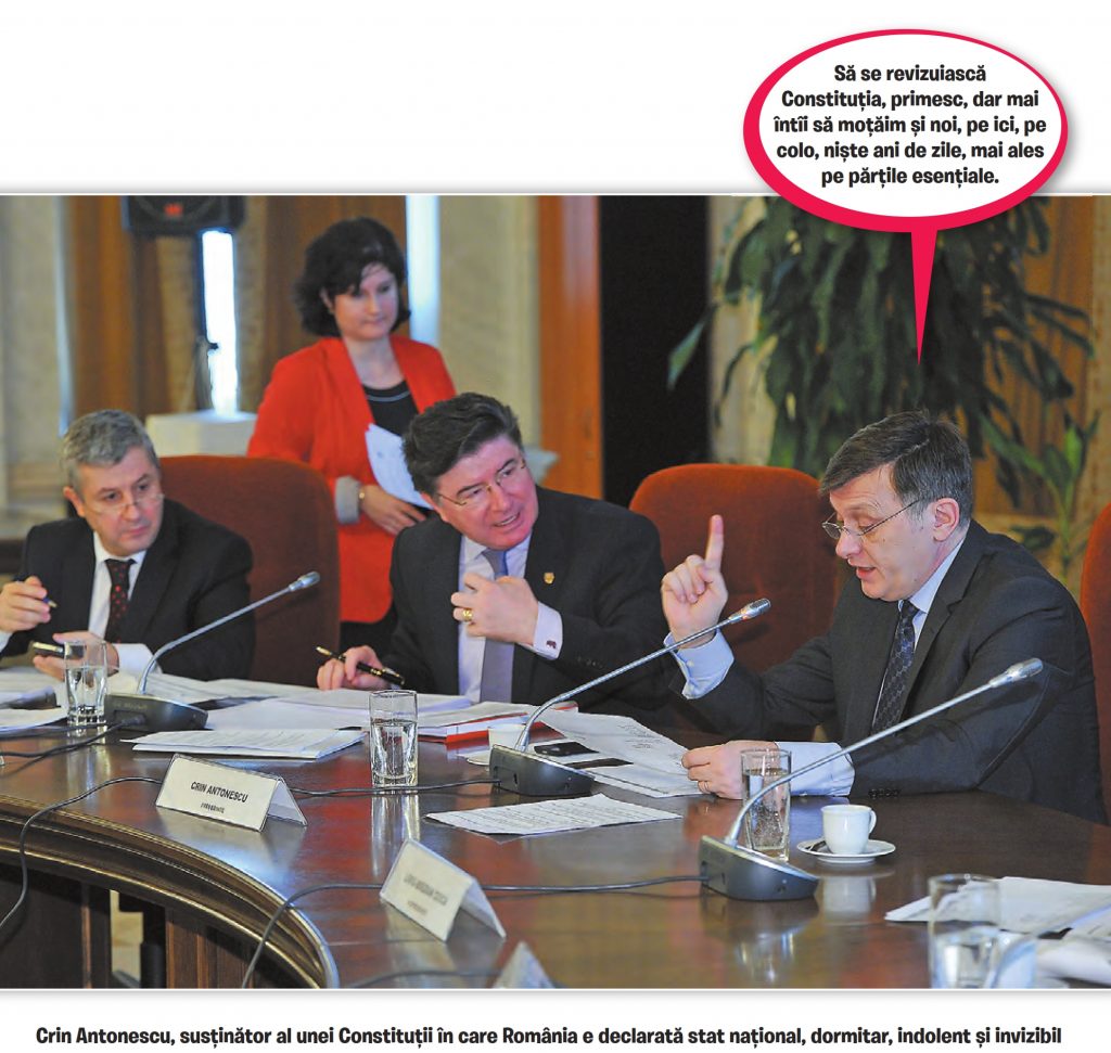 schimbarea Constituției. USL, marea alianță contra naturii care a câștigat triumfal alegerile din 2012, nu doar că avea posibilitatea de a schimba Constituția fără probleme, având majoritatea parlamentară necesară, dar și promisese asta în campanie. Constituția trebuie schimbată pentru a pune în mișcare proiectul de regionalizare și pentru a împiedica apariția unui nou președinte precum Traian Băsescu. Dar proiectul de schimbare a Constituției a fost dat pe mâna lui Crin Antonescu. Consultările cu societatea civilă au început în forță și s-au împotmolit repede, în jurul unor propuneri făcute de Biserică. Una dintre ele presupunea ca prin Constituție să se recunoască rolul Bisericii Ortodoxe și al celorlalte culte în constituirea și modernizarea statului român. După care, fiindcă tot era vorba despre modernizarea statului, tot Biserica cerea vehement ca familia să fie definită ca fiind uniunea dintre un bărbat și o femeie. Vorbim, iată, despre anul 2013, anul în care s-a născut și a murit ideea modificării Constituției, sub privirea adormită a celui ce era să fie președintele României. Da’ n-a mai fost să fie, cum nici modernizator de Constituție n-a mai fost.