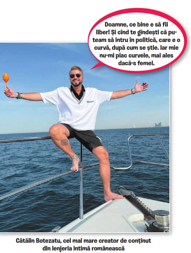 Știu că e greu de crezut, dar cea mai importantă resursă naturală a României nu e nici aurul, nici sarea și nici bauxita. E Cătălin Botezatu, o sursă nesecată de aventuri trecute, prezente și viitoare. O sursă inexorabilă de hormoni și alte bazaconii. După ce a fost roastuit la un show de către Dan Frînculescu, despre presupusa relație cu Elena Ceaușescu, Botezatu a răspuns: „Doamna Elena Ceaușescu a anunțat că mă dorește doar pe mine să îi ofer flori, am devenit într-un mod tacit preferatul ei. Datorită dânsei, în mai puțin de 24 de ore, am primit buletin de București. Au urmat și intimități, dar mai târziu. Dar nu era ușor să fiu preferatul Elenei Ceaușescu. La fiecare ofertă de flori, trebuia să fiu cu analizele la zi, nu trebuia să fiu răcit. S-a scris că am fost amantul Elenei Ceaușescu, ce pot să spun eu e că am avut o relație foarte specială, dar un bărbat adevărat nu spune niciodată ce femei a avut. Prin patul meu au trecut foarte multe femei celebre, cu soți celebri sau măritate în acel moment”.