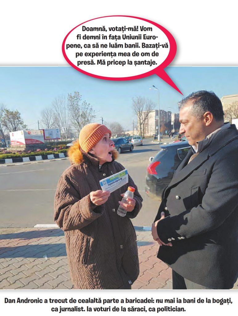 Dan Andronic, fost mare strateg electoral, actualmente candidat în Giurgiu, pe listele PMP, și-a dat seama că, neavând banii pe care-i avea la dispoziție pe vremea când nașul Niro era liber și învârtea comisioanele de la Microsoft, mai bine ar fi să se interzică de tot campania electorală la televizor și pe Facebook. Aia în presa scrisă nu, că tot mai pică ceva, poate. Da’ televizorul și Facebook-ul să le fie interzise politicienilor, că poate așa merg și ei pe jos, prin piețe și târguri, îmbrâncindu-se cu cetățeanul, simțind România reală.