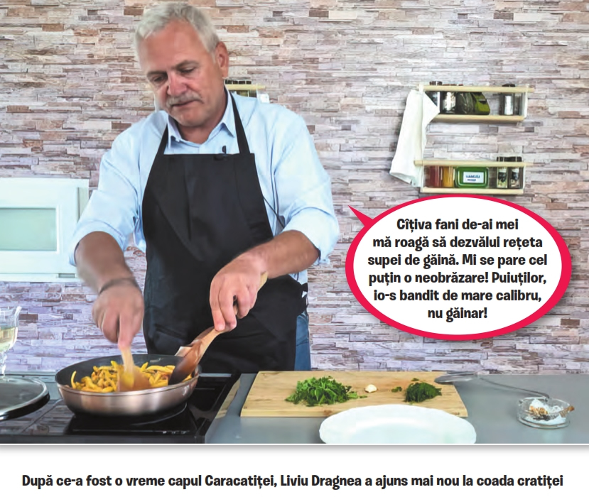Penultima rețetă postată de Dragnea, în urmă cu două săptămâni, se cheamă „Cotlet de vită cu sos de cimbrișor“. Înainte de asta, postase o rețetă cu numele „China este într-o ofensivă uriașă“. Rețetele lui Dragnea se transformaseră într-un comentariu politic croit pentru gusturile publicului România TV. În timp ce învățai să faci de mâncare, trebuia să dai din cap aprobator și să spui: „Da, globaliștii chiar vor să ne spele pe creier, aveți mare dreptate, domnule Dragnea. De fapt, mi-ați devenit, prin aceste declarații, atât de simpatic, încât îmi vine să vă salvez din ghearele teroriștilor care v-au îmbrăcat cu șorțul ăla și v-au pus în fața camerei ca să vă facă de rușine“.