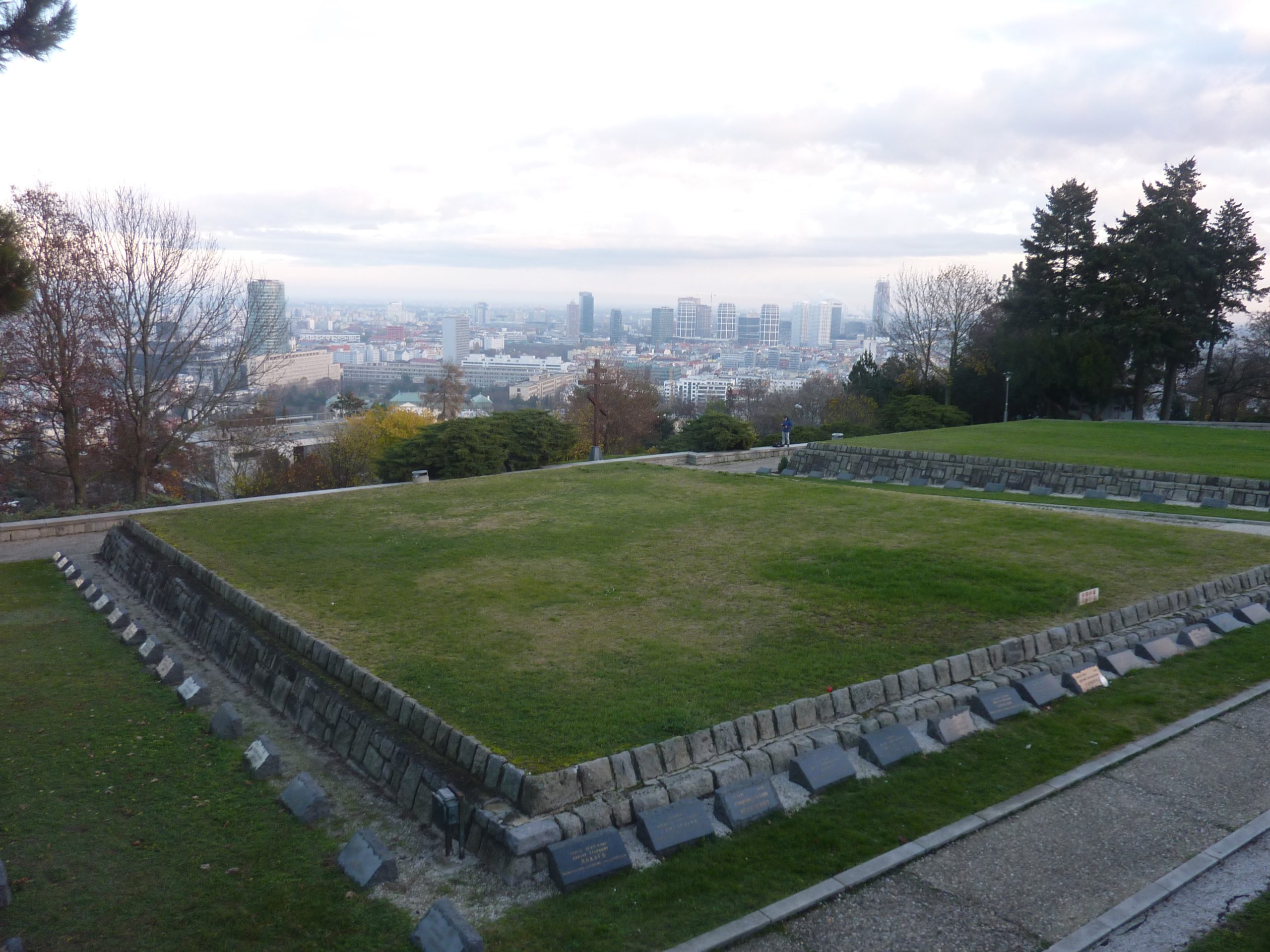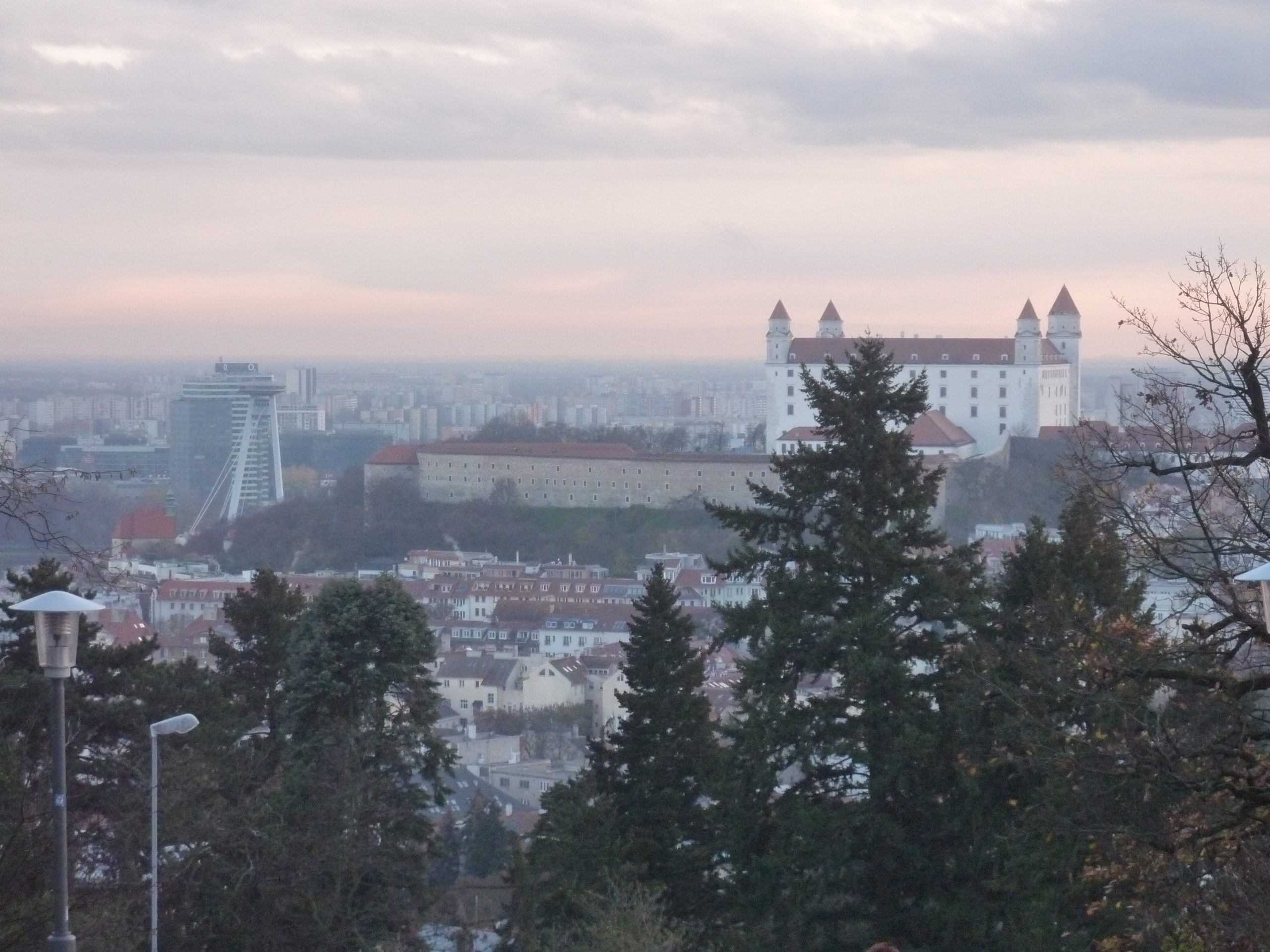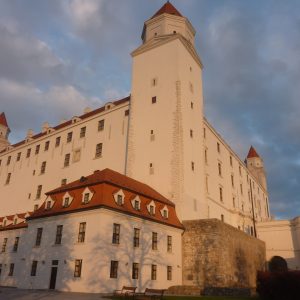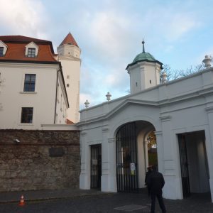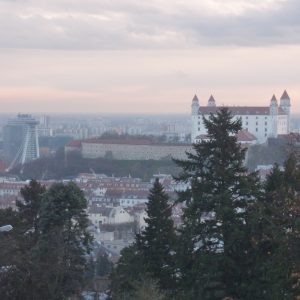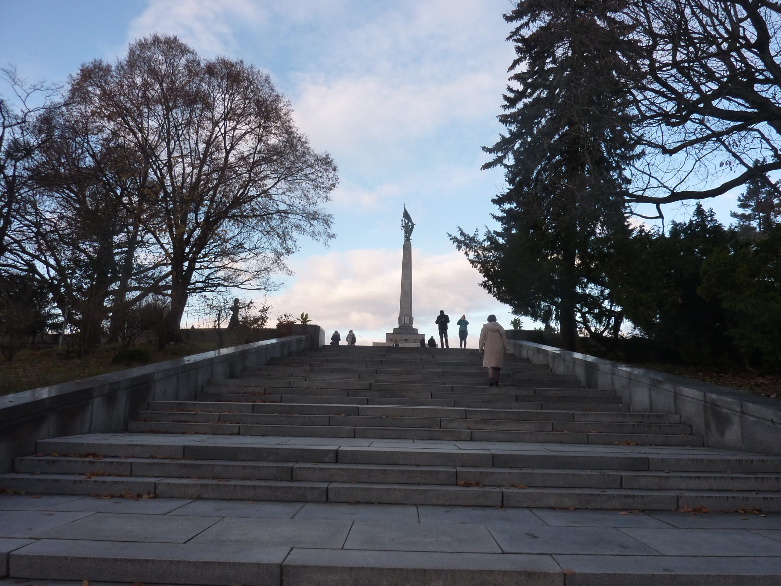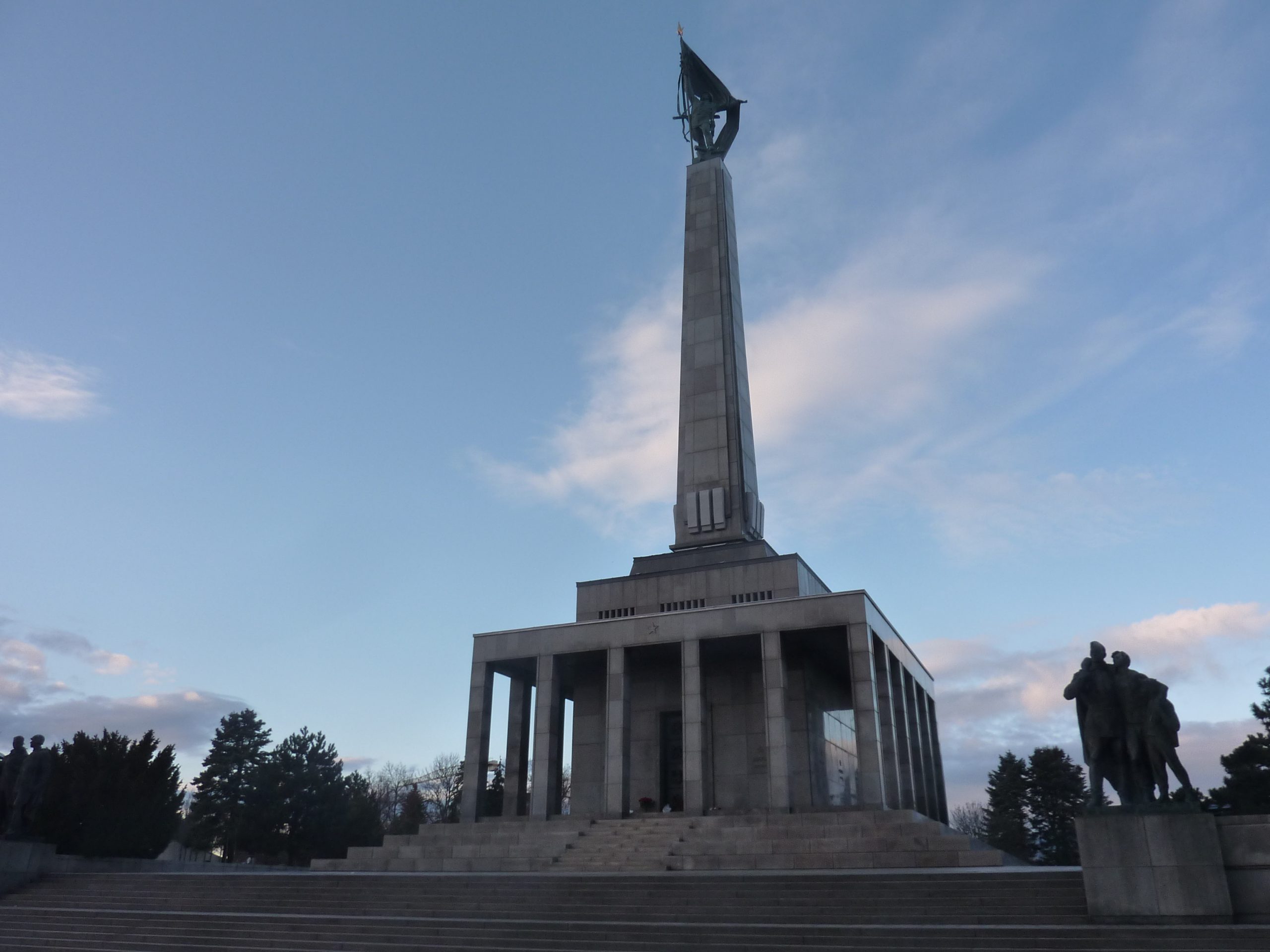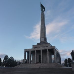 Pe dealul Slavín (poreclit al lui Napoleon, fiindcă celebrul împărat francez a pus de-o tabără aici, în timpul asediului Bratislavei), locul primei opriri a autocarului, nu ajunsesem în 2006. Strada îngustă, care urcă în serpentine, pe lîngă casa fostului președinte Alexander Dubček, liderul Primăverii de la Praga, reședințe de ambasade și vile de oameni foarte bogați, cu valoare de piață exprimată printr-o cifră divizibilă cu 2 și șase zerouri în euro, se oprește aproape de vîrf, la memorialul și cimitirul miilor de soldați sovietici rămași definitiv aici în cel de-al doilea război mondial – Slavín, un monument ridicat în superbul stil stalinist. Ostașul cu steag în mînă de pe obeliscul de 42 de metri înălțime se uită fioros spre orașul de sub el și la colina din apropierea Dunării, cea a Castelului, care, cu cele patru turnuri ale sale, unul în fiecare colț, pare o masă răsturnată. Fix acolo, lîngă Parlamentul slovac (care arată tot ca o cantină studențească a anilor ‘80, cum mi s-a părut și atunci), la Castel, am coborît a doua oară din autocar, ca să vedem aceeași Bratislava de sus, dar din alte unghiuri.