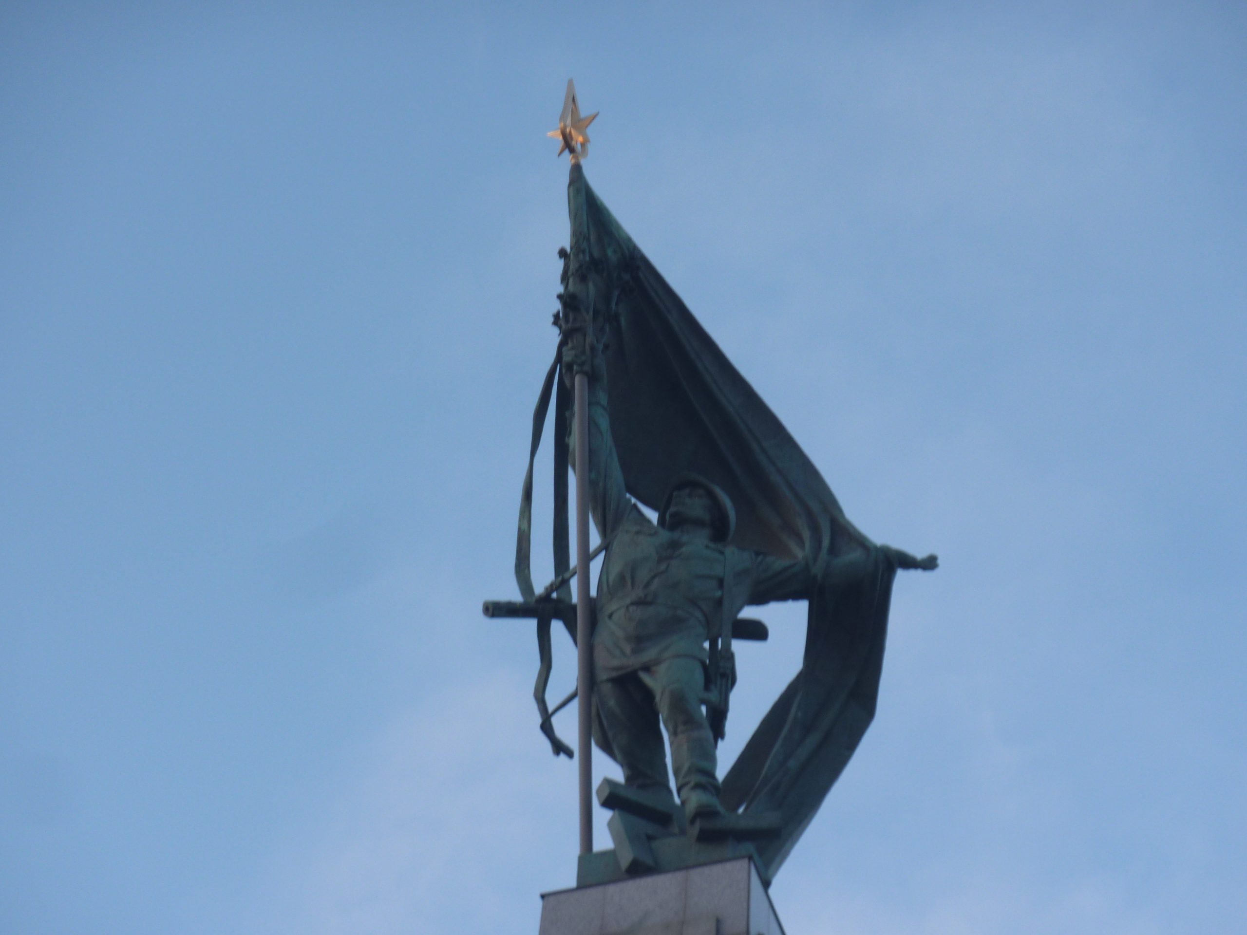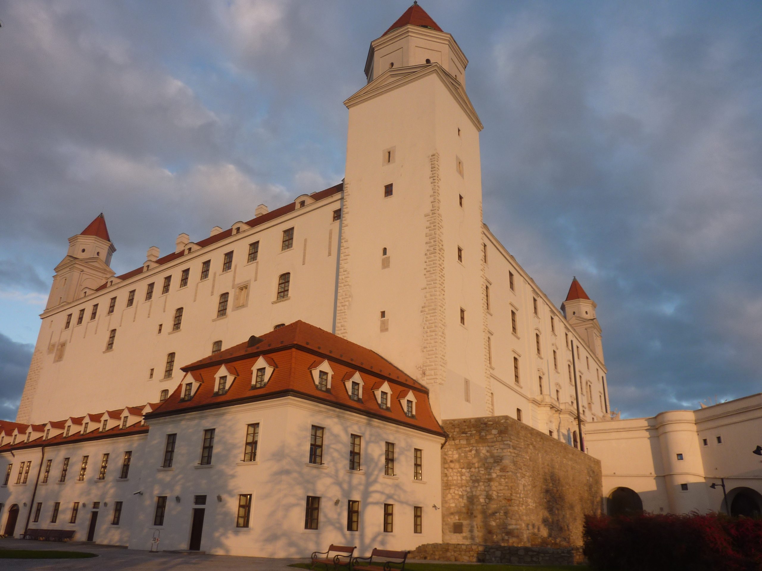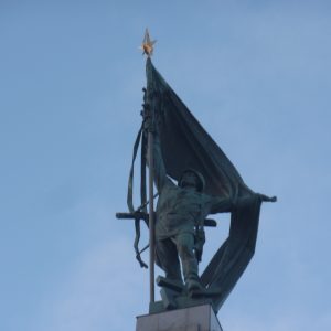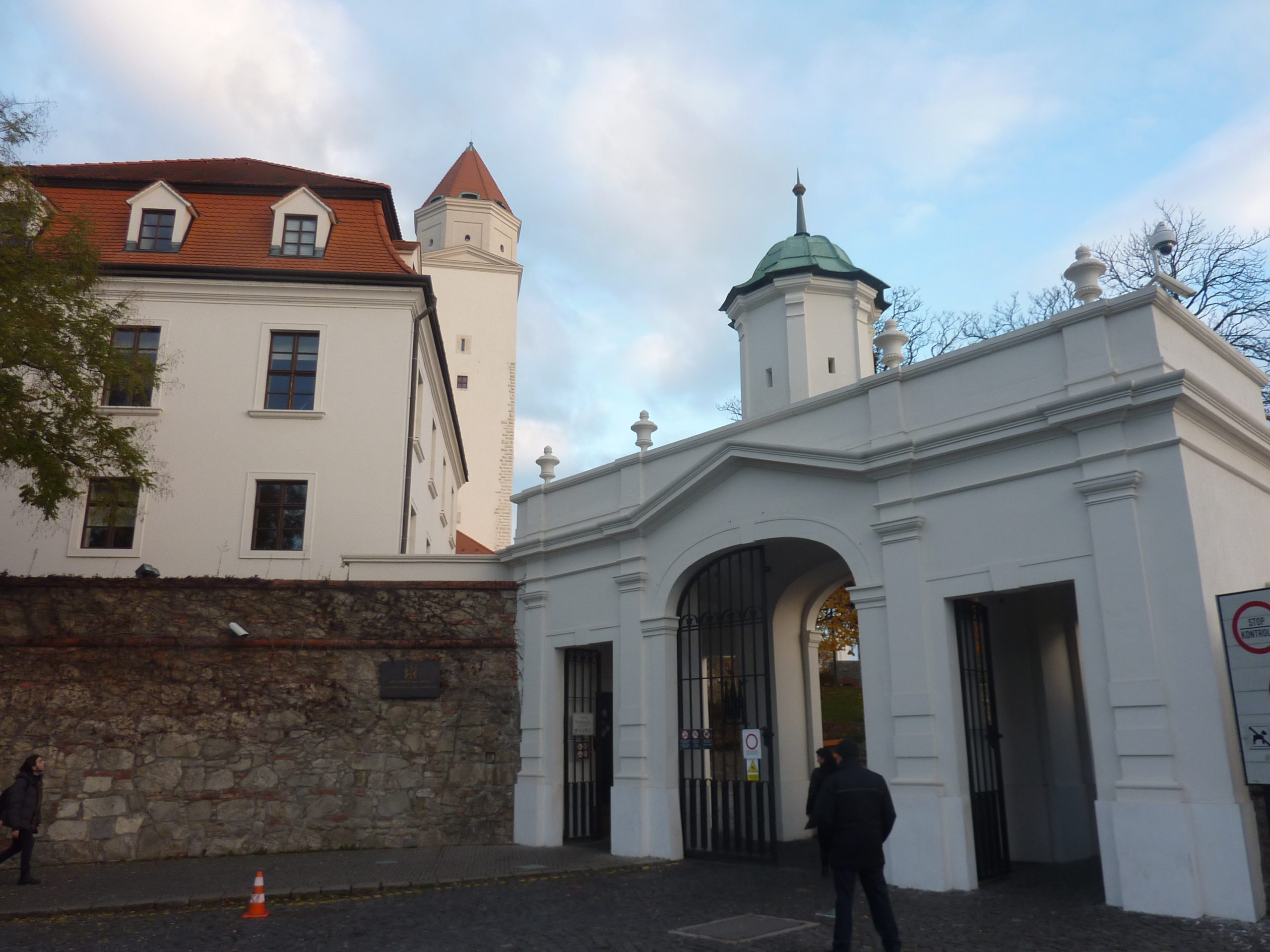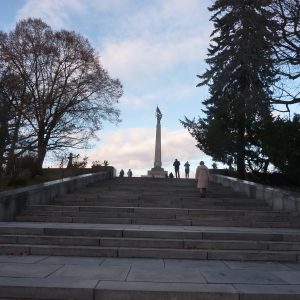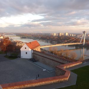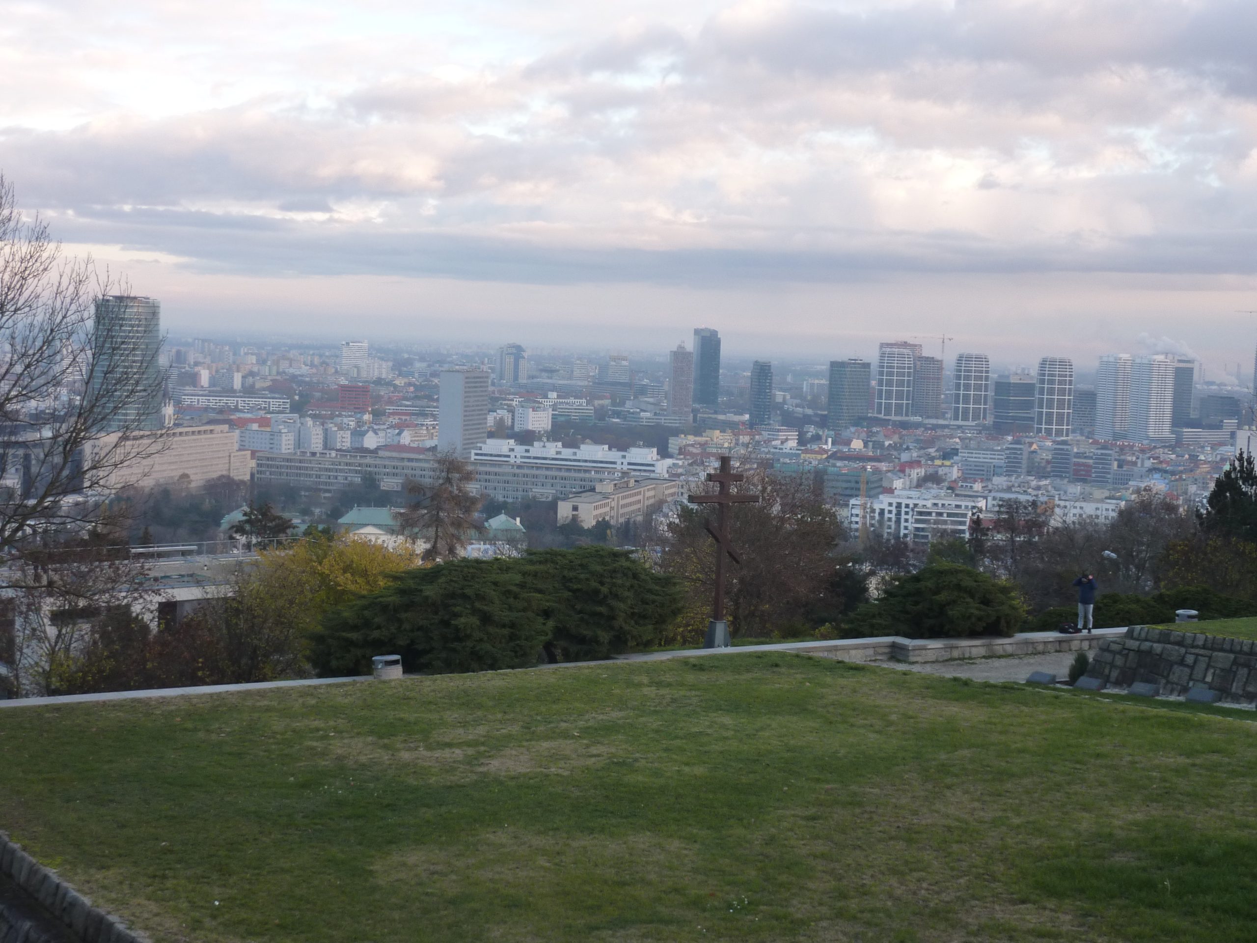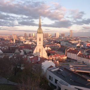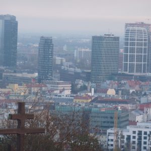 Pe dealul Slavín (poreclit al lui Napoleon, fiindcă celebrul împărat francez a pus de-o tabără aici, în timpul asediului Bratislavei), locul primei opriri a autocarului, nu ajunsesem în 2006. Strada îngustă, care urcă în serpentine, pe lîngă casa fostului președinte Alexander Dubček, liderul Primăverii de la Praga, reședințe de ambasade și vile de oameni foarte bogați, cu valoare de piață exprimată printr-o cifră divizibilă cu 2 și șase zerouri în euro, se oprește aproape de vîrf, la memorialul și cimitirul miilor de soldați sovietici rămași definitiv aici în cel de-al doilea război mondial – Slavín, un monument ridicat în superbul stil stalinist. Ostașul cu steag în mînă de pe obeliscul de 42 de metri înălțime se uită fioros spre orașul de sub el și la colina din apropierea Dunării, cea a Castelului, care, cu cele patru turnuri ale sale, unul în fiecare colț, pare o masă răsturnată. Fix acolo, lîngă Parlamentul slovac (care arată tot ca o cantină studențească a anilor ‘80, cum mi s-a părut și atunci), la Castel, am coborît a doua oară din autocar, ca să vedem aceeași Bratislava de sus, dar din alte unghiuri.