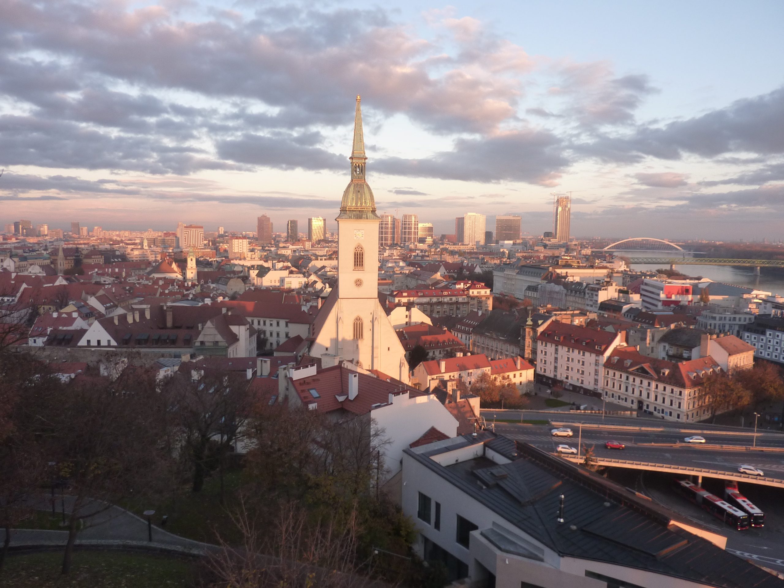 Dintre toate clădirile vizionate pe geam, ministere, muzee, bănci, galerii de artă, am mai recunoscut doar catedrala Sf. Martin (o biserică de sfîrșit de secol XIV cu o coroană de 1,2 metri placată cu șapte kilograme de aur pe acoperiș, care, timp de trei secole, a fost locul de încoronare a regilor maghiari), palatul Președinției, fosta reședință a contelui Anton Grasalkovič, un fel de consilier privat – adică, de alcov –, al reginei Maria Terezia (la arteziana din față, am făcut prima poză în Bratislava, așteptînd-o pe tipa de pe Couchsurfing la care am dormit o noapte) și cea mai veche universitate, Academia Istropolitana, fondată de Matei Corvin, în campusul căreia băusem niște beri cu Eusebiu, camaradul de drum de atunci.