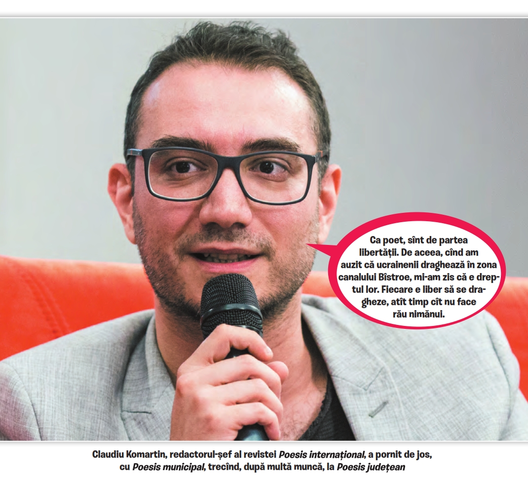 Poetul extraordinar care e Claudiu Komartin e și un om care trăiește cu picioarele pe pămînt, și e cît se poate de atent la ce se petrece în jurul nostru și în lume. Încît, convins că la noi spiritul critic în derivă trebuie fortificat, e de părere că ar trebui să ne fortificăm și „vigilența inimii“. Îl exasperează amestecul inept al politicienilor în treburile culturii și îl îngrijorează ușurința cu care mușcăm din ceea ce vînd vectorii propagandei rusești.