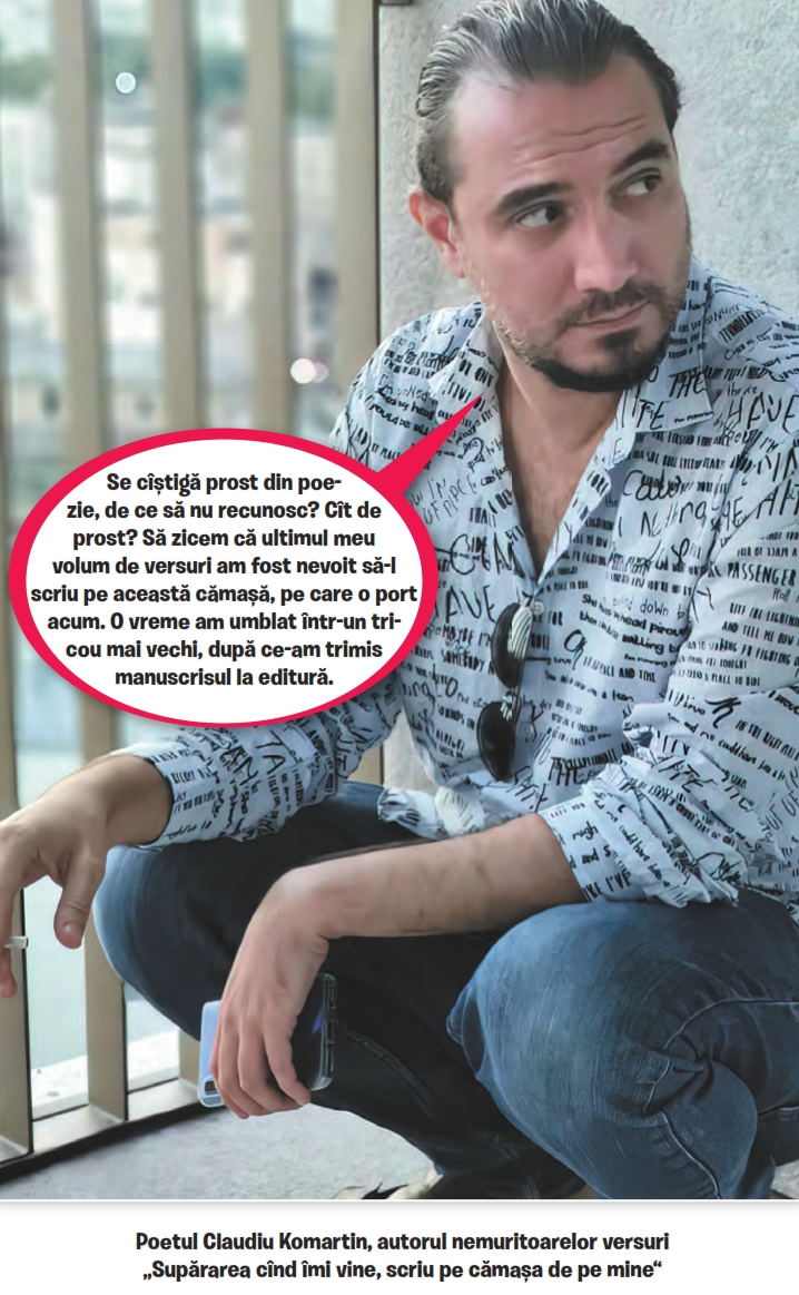 Cel mai important poet apărut la noi după anul 2000. Ultratalentat, uluitor de inteligent și cu o etică sinucigaș de netranzacționistă, Claudiu Komartin își merită cu prisosință reputația. Și premiile. A abandonat facultatea, fiindcă și-a găsit dascăli în altă parte. Democrat convins. Are cultul prieteniei și, de fapt, nu vrea imposibilul – doar că normalitatea la care visează ar lăsa în aer cohortele de lichele, de impostori și de răpciugi care poluează tot ce ne înconjoară.