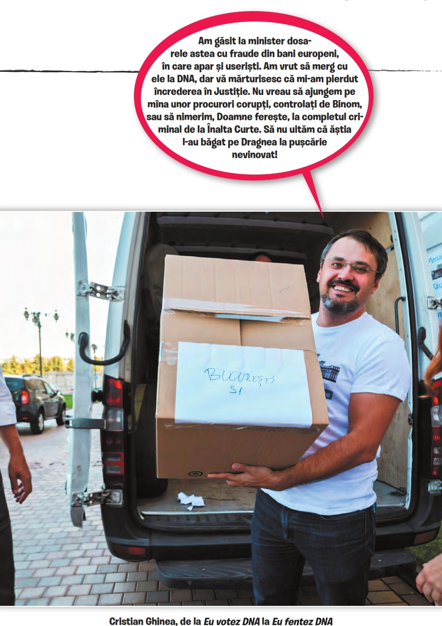 Ei bine, tot acolo se mai găsește ceva. Ministrul Ghinea mai ține sub fund și niște dosare. Sînt dosare de fraudă la fondurile europene, cel puțin 15, la cîteva milioane de euro bucata. Formal, aceste documente se cheamă rapoarte de control și sînt efectuate de Corpul de Control al ministerului. Corpul de Control a constatat că s-au furat banii și a pus rapoartele la dispoziția ministrului ca să le trimită la DNA. Dar ministrul Ghinea nu le trimite, ci le ține sub dosul său acoperitor.