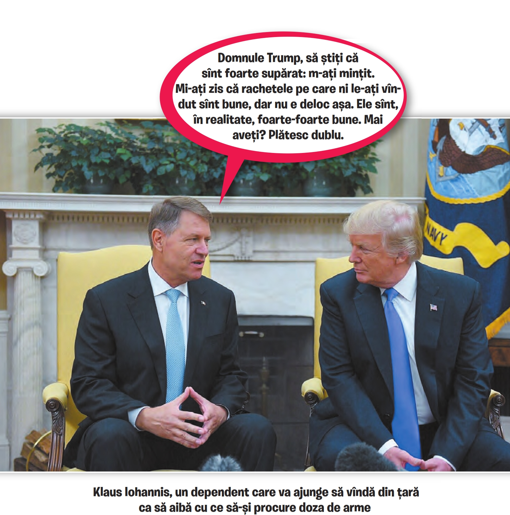 Imediat, SRI și George Maior, organizatorii vizitei lui Iohannis în SUA, au introdus această oportunitate în program și au obținut o conferință de presă comună pe peluza Casei Albe cu Iohannis și Trump. Ca orice om de afaceri care măsoară necesitatea cu ajutorul profitului, Trump și-a frecat mîinile. A primit ofranda depusă de Iohannis, a ieșit la poze pe gazon și a emis factura.
