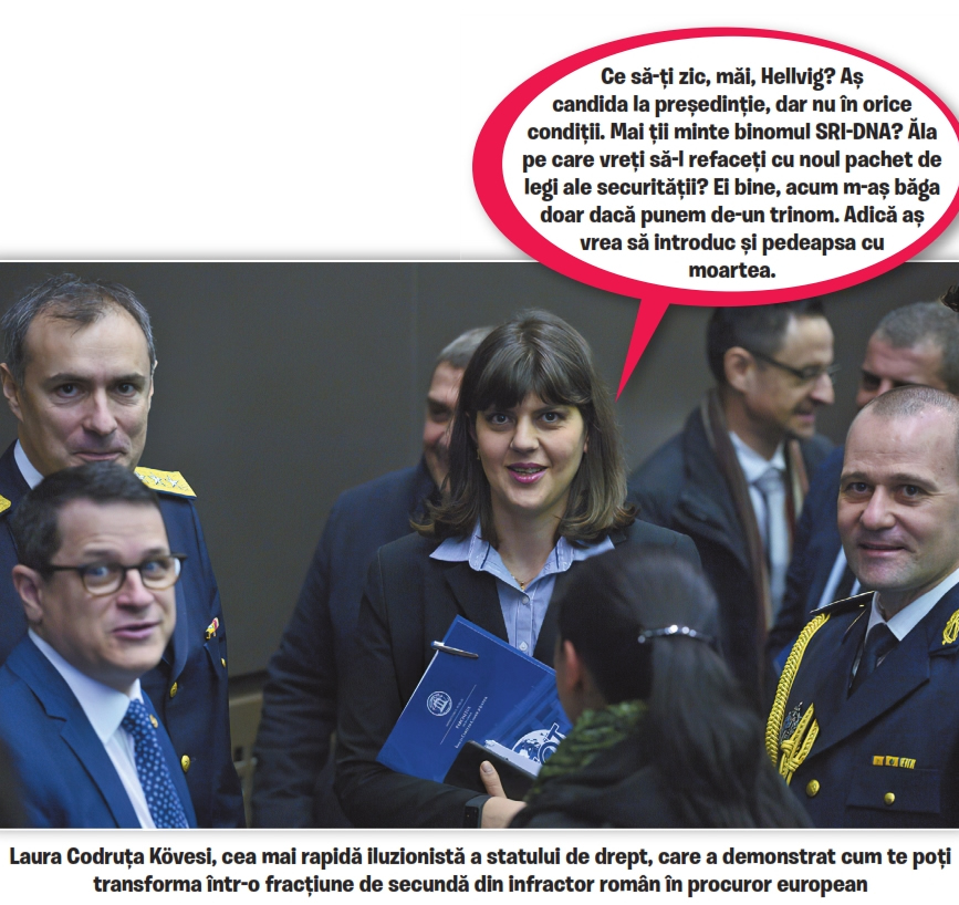 Doamna Kövesi, regina detronată a protocoalelor dintre parchete și SRI, nu traversează cea mai bună perioadă profesională. Pentru că, totuși, în Luxemburg, unde-și are biroul de șefă a Parchetului European, nu merg lucrurile chiar așa cum mergeau la București. PR-ul mai merge, de mers, dar tot mai mult pe la București decât prin restul Europei. Pentru că, na, nici fondurile de la Coldea nu mai există, pentru că nu mai există Coldea însuși în poveste. Dar ce frumos era pe vremuri, ce minuni prin presa străină făceau faptele de vitejie ale doamnei…