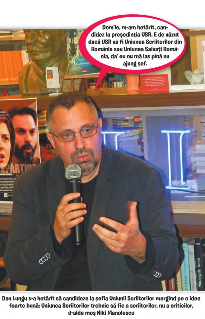 E prima oară cînd mă văd în conflict de interese ca scriitor și jurnalist. Adică sînt, ca scriitor, președinte ales al Uniunii Scriitorilor, iar ca jurnalist îl întreb pe confratele Dan Lungu de ce candidează la președinția USR, despre care Nicolae Manolescu susține că i-ar fi președinte. Altminteri cred în capacitatea, dovedită cu brio, de manager cultural a lui Dan Lungu. Ne asemănăm la program, cu deosebirea că Grupul de reformă al USR pe care îl conduc a început disputa cu N. Manolescu și cu comilitonii săi cu trei ani în urmă, pentru a aduce Uniunea în legalitate și pentru a o scăpa de ilegalitățile, abuzurile și de sforăriile nerușinate făcute de cel ce se pretinde președintele USR împreună cu trupa lui.