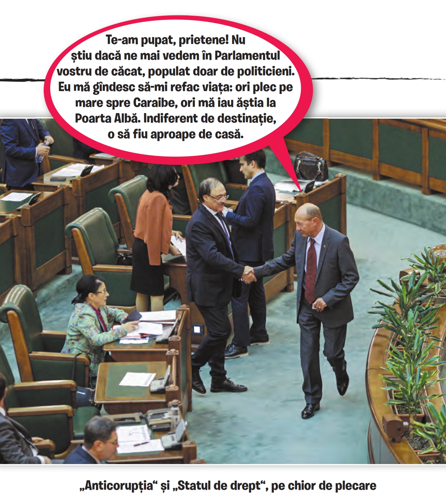 Pe Băsescu, ferit pînă acum de necazuri penale prin oficiile protectorilor săi licurici, din al căror șliț a supt lumină, l-a mîncat în cur să facă publice fraze dintr-un document clasificat. Un document odios, de altfel, la a cărui existență a participat personal ca președinte al României, dar, potrivit legii, un document secret. Hîrtia, emisă de SRI și adresată Înaltei Curți de Casație și Justiție, le cere judecătorilor ca, în baza protocolului cu SRI, să admită ca o informare livrată de ofițeri să ajungă la procurorii de caz fără să ajungă și la avocații inculpatului. Adică să lipsească apărarea de șansa unui proces echitabil.