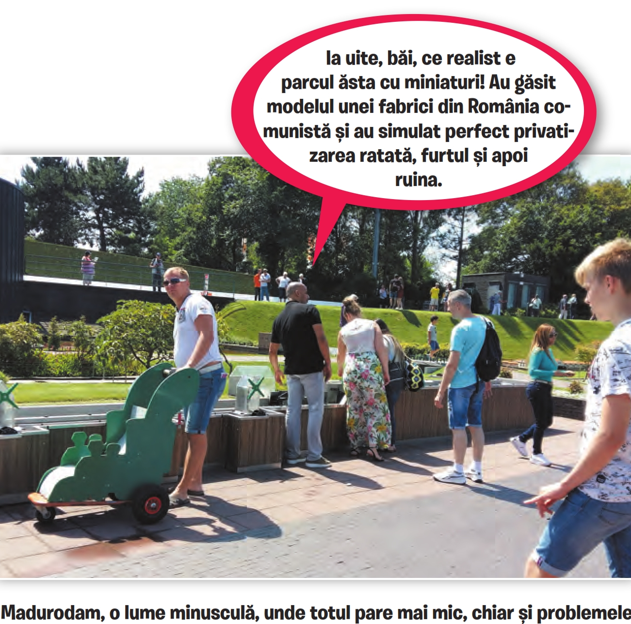 Jucărioare? Da, am zis bine. Trenulețe, mașinuțe, vaporașe, tramvăiuțe (!), elicopterașe, șlepulețe (Olanda!), ecluzici, chestii de-astea. Pentru copii păreau extrem de reale, și chiar erau (puteai bine-mersi să le pipăi și să urli), dar interesant este că și oamenii-n toată firea le luau drept ce nu erau: realitate. Îmi venea să bat tot Madurodamul și să mătur cu ei pe jos: bă, astea-s de jucărie! Bă, nu vă infantilizați singuri ca proștii, bă, nenorociților! Ieșiți, bă, din peșteră, căscați ochii, afară e-o omenire sângerândă! Afară-s lupii, orbilor!