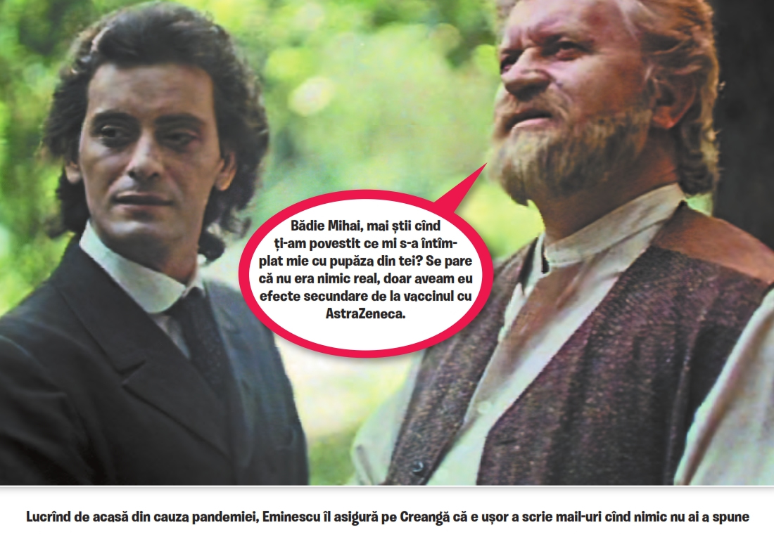 Eminescu merge să se vaccineze pe Blaj, pentru că acolo a găsit loc liber pentru Pfizer. Când ajunge în mica urbe din Ardeal, poetul declamă cu patos: „Te salut, mică Romă!“. Câțiva băieți care sparg semințe în fața unei agenții de pariuri din centrul orașului îl aud și se iau de el: