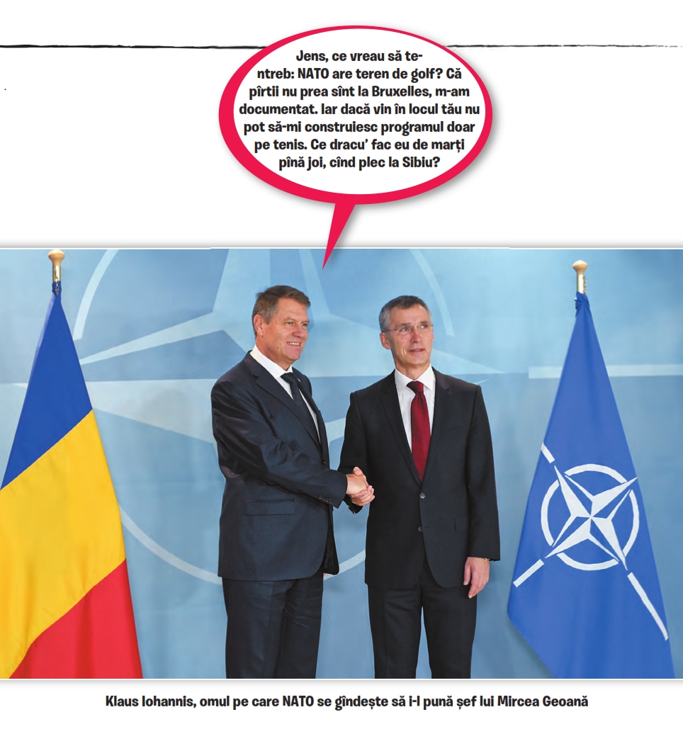 Sigur, Iohannis mai are trei ani de jucat golf în România și n-ar putea merge la Bruxelles decît dacă și-ar da demisia mîine, dar să depășim bariera calendarului și să ne imaginăm cum ar arăta alianța nord-atlantică sub mandatul lui Iohannis. Putem începe cu zborurile săptămînale Bruxelles-Sibiu, cu plecare joia și întoarcere marți. Apoi, ar veni la rînd „Consiliul meu“, avîndu-l în frunte pe Nicolae Ciucă, programul „Alianța educată“, întins pe două mandate și patru pagini maximum, fără etapă de implementare, și reamenajarea Vilei Lac 2 din Bruxelles după gusturile doamnei Carmen. Pentru declarațiile oficiale va fi recrutat un prompterist de limbă engleză, care va avea liber în situațiile de criză, fiindcă atunci Klaus Iohannis dispare, după cum știm, cu lunile.