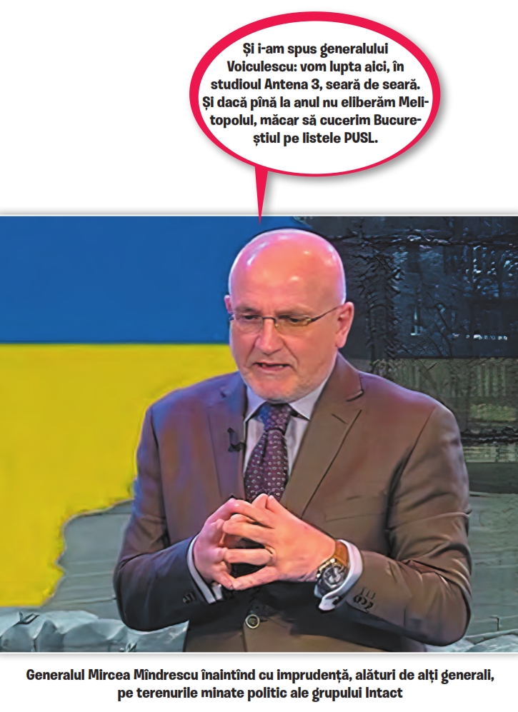 Să observăm că acest grup de generali ultramediatizați formează deja un brand public, deci politic. E de așteptat, așadar, ca Dan Voiculescu să nu piardă ocazia și să-i îndese pe generali în mica sa barcă politică, așa cum are obiceiul. Ambițiile lui politice se numesc azi PUSL, dar numele de cod e „Grupul Intact“. Prin televiziuni, adică prin troc mediatic, Voiculescu își sponsorizează visul de putere o dată la patru ani, cînd reușește, fără emoții, să-i vîre PSD-ului pe gît liste cu oamenii lui. Șansele PUSL să treacă pragul electoral sînt egale cu șansele lui Nuțu Cămătaru să ajungă în rai, așa că Voiculescu va trebui ori să facă o coaliție cu PSD, ori să-și strecoare echipa pe listele PSD și apoi s-o regrupeze în Parlament.