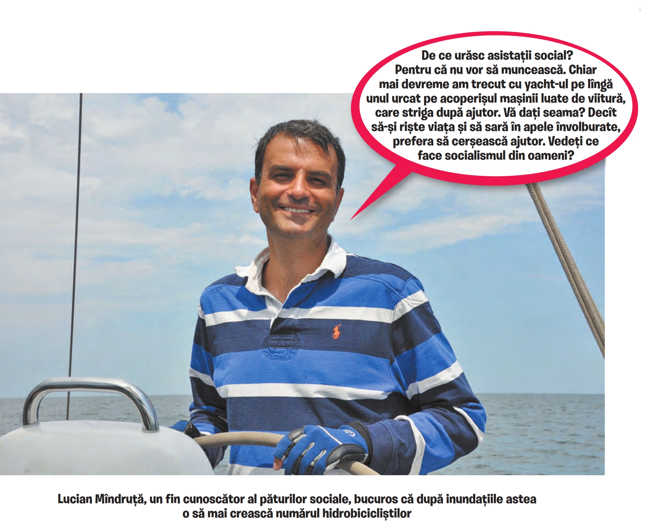 Noroc nesperat pentru sătenii sinistrați din localitatea Gratia, Teleorman, după ce Lucian Mîndruță a anunțat că vine în ajutorul lor cu lecții gratuite de iahting. ”Poate că oamenii ăia văd doar o nenorocire în inundația care le-a luat agoniseala de-o viață. Eu vreau să le arăt că nu e așa. O inundație care îți distruge casa poate să fie și o excelentă ocazie de a căpăta niște îndemânări noi și de a te alege cu un hobby foarte relaxant”, a explicat Lucian Mîndruță.