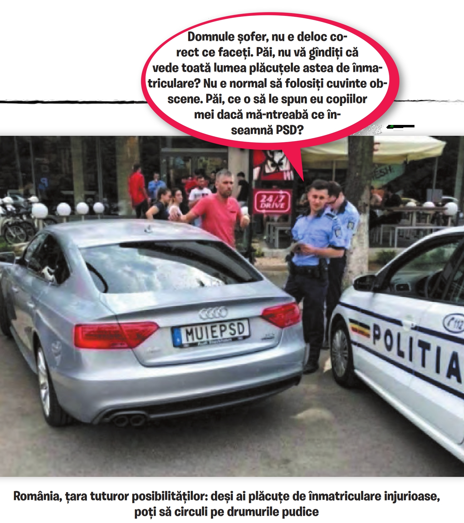 Precipitarea Poliției Rutiere autohtone după această operațiune, cu dosar penal și confiscarea permisului împricinatului, seamănă cu decizia subită pe care a luat-o Ghiță Pristanda cînd l-a băgat la arest pe Nae Cațavencu, la ordinul prefectului Tipătescu. Cațavencu îi zice lui Pristanda că e neconstituțional ce face, la care polițistul acceptă: „Curat neconstituțional. Dar umflați-l!”. N-aș vrea să cred că Poliția Rutieră a dat curs unui ordin politic, în cazul concetățeanului nostru cu „MUIEPSD”, dar m-aș fi așteptat ca vajnicii noștri polițiști să cunoască legile, înainte de a le aplica după ureche. Tehnic, Poliția Rutieră română ar fi trebuit ca mai întîi să-i sesizeze pe omologii lor din Suedia asupra naturii insultătoare, în România, a combinației de litere de pe tăblița de identitate a mașinii compatriotului nostru. Și de-abia după ce suedezii ar fi decis că „numărul” mașinii trebuie retras, să-i ia carnetul posesorului, fiindcă circulă cu un număr care a devenit ilegal. Altfel, Poliția Română a acționat conform unei haiducii politice de rahat, în care sergentul de stradă execută ordinele superiorilor numiți politic, iar la un caz de ceva, tot el o pățește. După ce s-a pus dandanaua în mișcare, se trezește Poliția Română că i-a deschis degeaba dosar penal tipului, căci omul nu încălcase nici o lege.