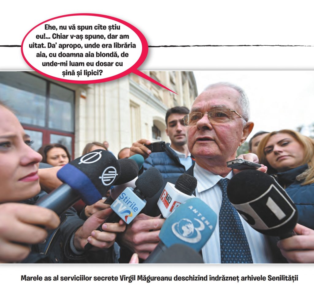În vinerea cu pricina l-am luat cu mine pe Mihai Constantin, care era în perioada de probă la noi, și am mers la conferința cu pricina. (Da, Mihai Constantin, actualul purtător de cuvânt al Guvernului și mulți ani ziarist și prezentator al jurnalului TVR, a fost, o vreme, în probe la Academia Cațavencu. Chiar dacă n-a fost să trecem împreună de perioada respectivă, Mihai a ajuns un ziarist foarte serios și respectat, noi ne-am văzut de drumul nostru și am rămas, sper, amici.) Așadar, după ce joi, la ședință, anunțasem că fac eu pagina 3, cu partidul lui Măgureanu, vineri am fost cu Mihai la conferința de lansare, am făcut câteva poze și am plecat cu mult înainte de pișcoturile care făceau deliciul restului presei.