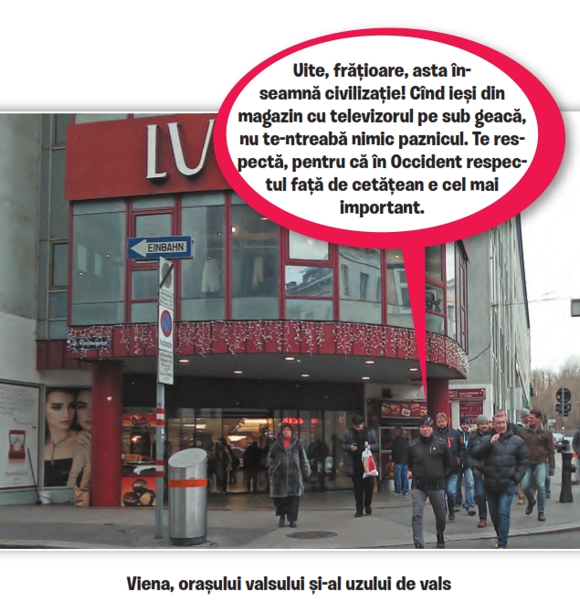 Ziua stăteam amândoi închiși în cameră, certându-ne pe telecomandă (n-aveam cărți, n-aveam jucării, n-aveam tabletă, n-aveam Kindle, nimic n-aveam), iar seara, când venea nevastă-mea, primeam și eu liber, să ies pe-afară, să respir, să cumpăr de mâncare, să beau bere la un sport bar, să mă plimb prin mall și să mă zgâiesc la oameni etc. (nevastă-mea nu e absurdă). Ceea ce și făceam. Și ce să vezi? Mall-ul, Lugner City, plin de interlopi. Repet: plin de interlopi. Nu am văzut niciodată așa ceva, și n-oi fi trăit eu mult pe lume, dar am trăit cu ochii deschiși. Domnule! Mă frecam la ochi, aveam senzația că sunt pe platou, că sub nasul meu se turnează un film românesc din ăsta postmodern, cu mafioți proști: pe la toate etajele mall-ului se plimbau grupuri de interlopi, câte trei, câte patru, câte cinci (n-am văzut cârduri mai mari de cinci), cu patrule de Poliție care stăteau cu ochii pe ei și cu agenți în civil care îi urmăreau discret, din priviri, în timp ce se prefăceau că-și butonează telefoanele. Îmi pare extrem de rău că sunt reporter și nu fotoreporter sau cameraman, pentru că spectacolul din mall era de necrezut.