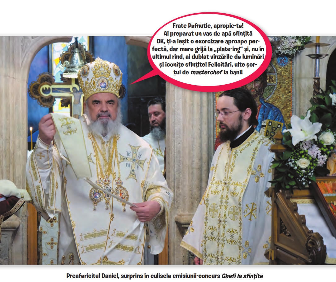 – Cum îndrăznești să-mi vorbești, păcătosule?!! se încruntă Patriarhul. Niciodată să nu pui termeni păgîni alături de sfinții noștri! Spune paranghelie, că sîntem biserică de rit bizantin! Dar ca să-ți răspund, deja nu mai contează, guvernul va plăti pentru ticăloșia sa!