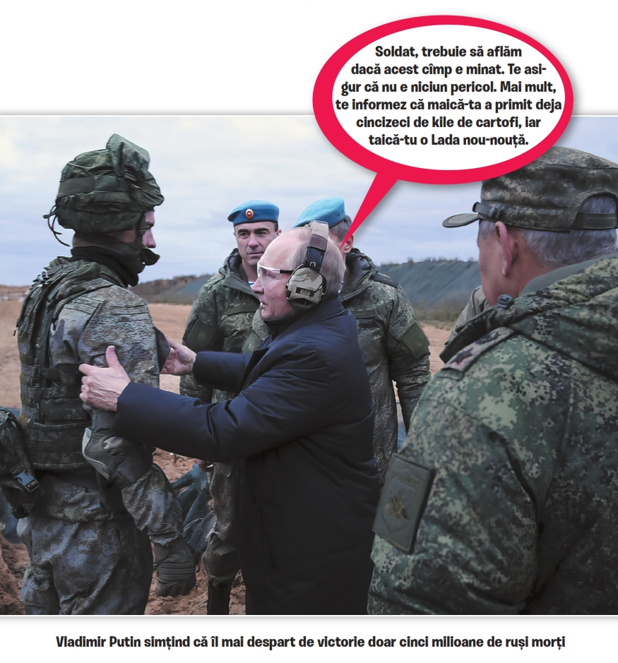 Cică o rachetă rusească de croazieră a intrat în spațiul aerian românesc. Tot ce e posibil. Sincer, nu știu de ce-mi reproșează mie românii chestia asta. N-am eu treabă pe unde umblă rachetele mele. Răspund de ele doar atât timp cât se află în depozitele armatei ruse. Odată ce-au fost trase, nu știu, nu mai e treaba mea. Sunt rachete majore, unele aflate chiar în pragul pensiei. Răspund singure pentru faptele lor. Dacă acea rachetă a intrat în spațiul aerian românesc, sunt de acord să fie adusă în fața Justiției, ca să explice ce-a avut de gând. Dacă vor românii, le mai trimit una. Nucleară.
