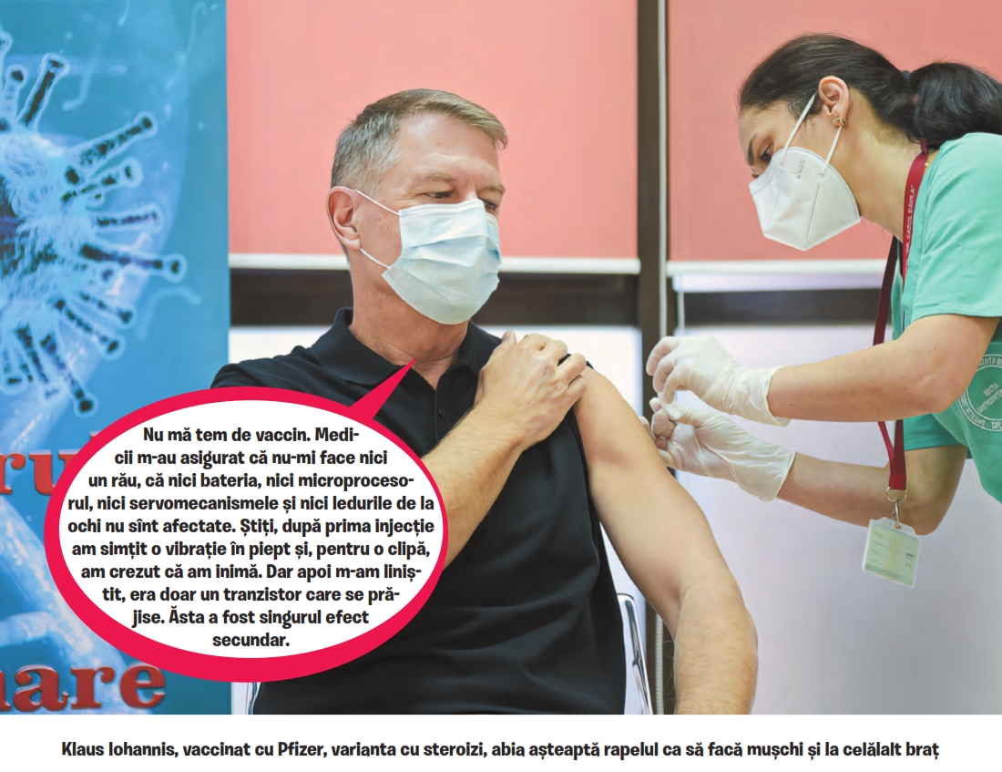 Am văzut și eu poza cu Iohannis la vaccinare. Nu mă miră deloc trupul bine lucrat la sală al președintelui. Probabil că s-a interesat din timp care-i faza cu vaccinul și, auzind că se face în mușchi, a avut o reacție de genul: „Aoleu, dar eu n-am mușchi. Trebuie să mă duc la sală să fac, altfel n-am unde să fac vaccinul“.
