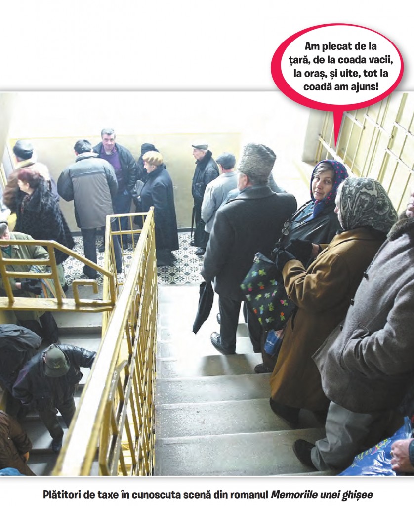 Am fost zilele trecute la Administrația Financiară Sector 6. Primisem acasă o decizie de impunere. Era o chestie pe care o mai plătisem cu câteva luni în urmă și pe care acum am primit-o din nou. La Administrația Financiară, aproape pustiu. O femeie la unul dintre ghișee, în rest totul liber. Am avut senzația că mi se întinde o capcană. Mă duc la un ghișeu și mă aplec. Evident, trebuie să te apleci. E unul din misterele acestei dimensiuni de existență: de ce naiba trebuie să te apleci? Sau de ce trebuie să te apleci chiar atât de mult? Las la o parte faza cu aplecat = umilință, birocrație etc. Faptul că e jos nu e totul. E și foarte mic. Pur și simplu este o fereastră pătrată de 40 de centimetri pe 40 de centimetri. Să ne înțelegem: e o fereastră tăiată în partea de jos a unui geam de termopan imens, netransparent. Evident că primul lucru care-ți vine în mine este: de ce naiba nu ați făcut-o mai mare?