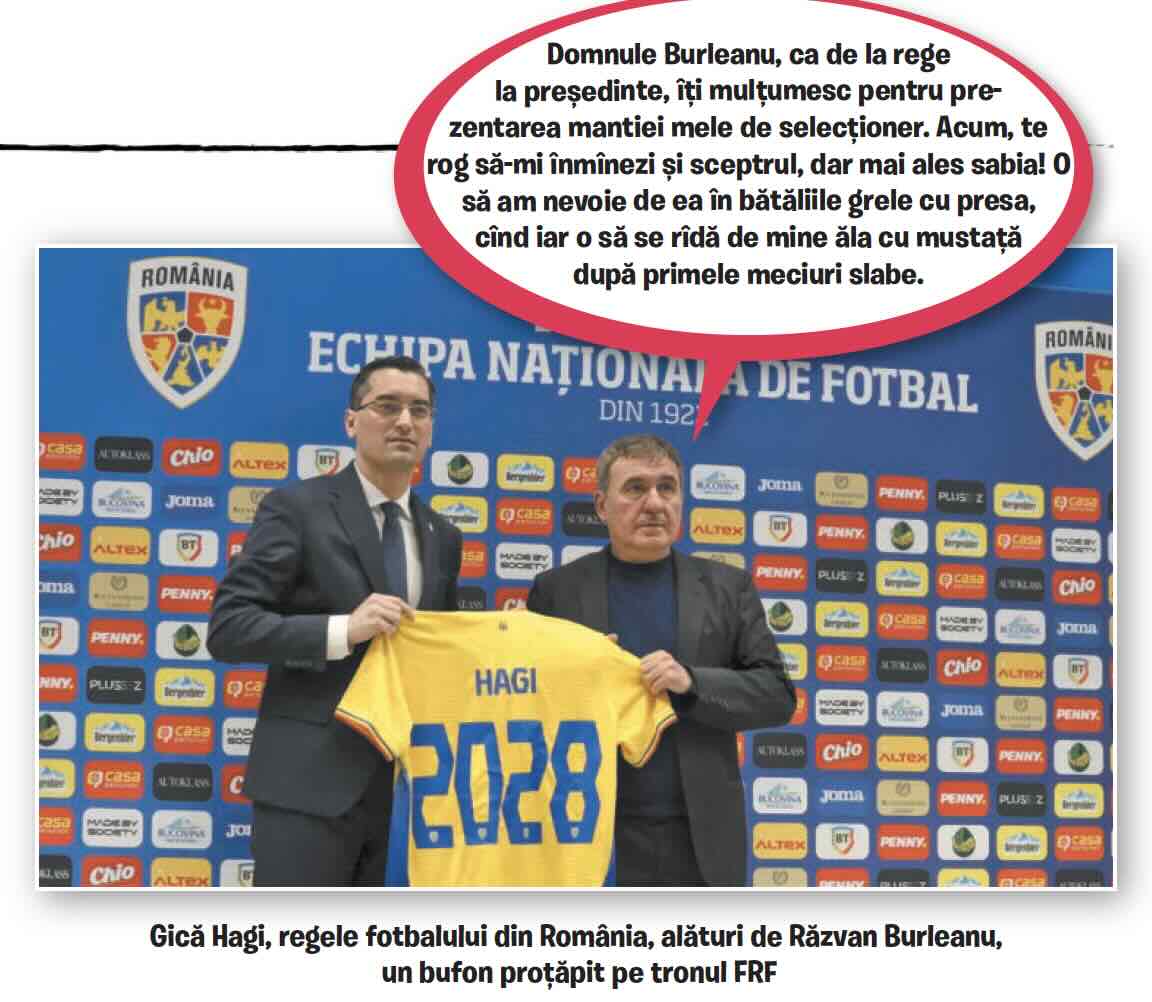 Grea misie pentru regele Gică, la reînscăunarea pe tronul de selecționer. Maiestatea Sa a tot spus că trebuie lucrat la mentalitate. Or, așa cum l-am mai avertizat, ca experți în sociologie, mentalitățile nu se schimbă de pe o zi pe alta. Procesul de modificare durează zeci și zeci de ani. Se fac 28 de ani, în curînd, de cînd Naționala a jucat ultima oară la Mondiale. Mulți dintre elevii profului Gică nici nu erau născuți pe vremea aia. Or, va fi cam complicat să le insufli curaj băieților ăstora care au apucat să vadă doar niște filme de epocă reliefînd tupeul eroic al luptătorilor din Gașca de Aur. Va fi și mai complicat să-l dezveți de criticisme și răutăcisme pe comentatorul român. Aveți înțelepciune, Maiestate, ca să nu vă sară iarăși țandăra.