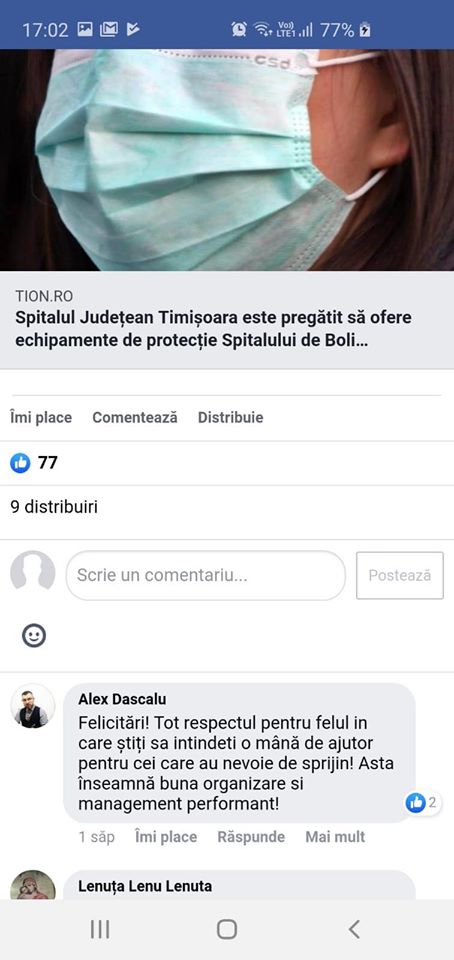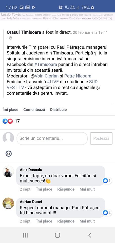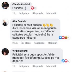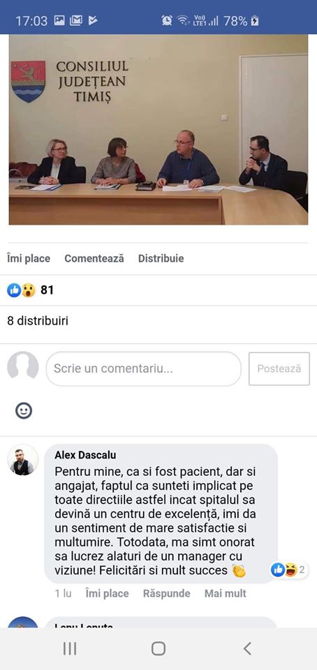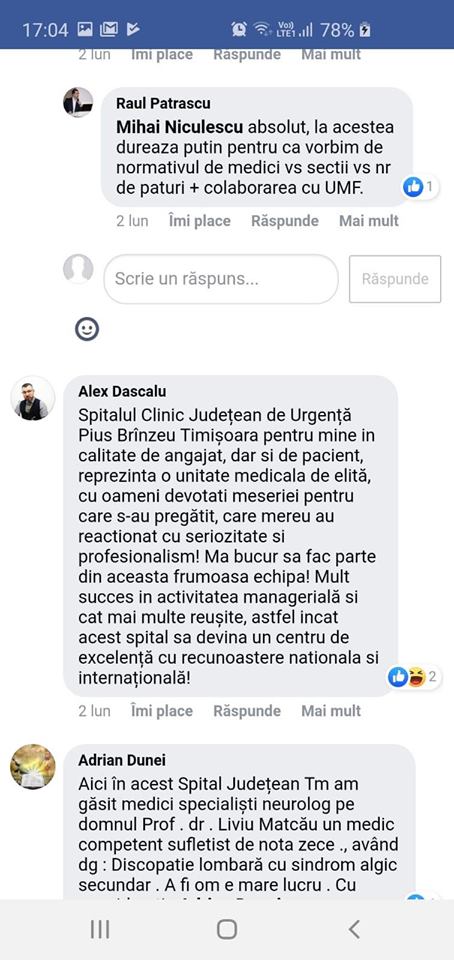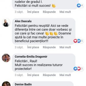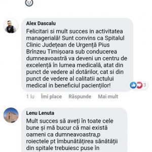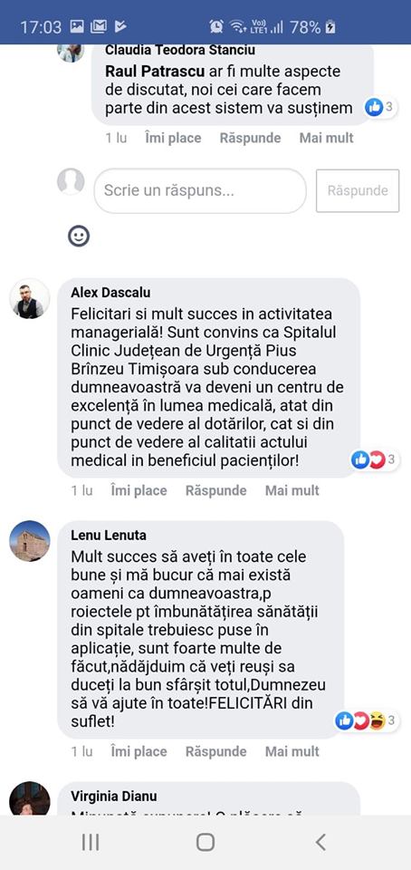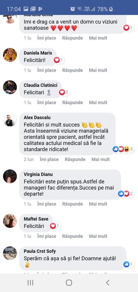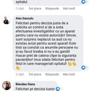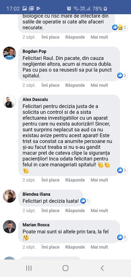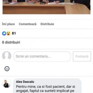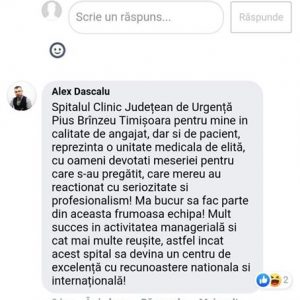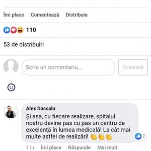 Alex Dascălu se numește ridicătorul de ode virtuale, iar operele sale nemuritoare (disponibile la finalul articolului) sună cam așa: „Felicitări! Tot respectul pentru modul în care știți să întindeți o mână de ajutor pentru cei care au nevoie de sprijin! Asta înseamnă bună organizare și management performant!“, „Felicitări pentru reușită! Aici se vede diferența dintre cei care doar vorbesc și cei care și fac ceva! Doamne ajută la cât mai multe proiecte în beneficiul pacienților!“, „Și așa, cu fiecare realizare, spitalul nostru devine pas cu pas un centru de excelență în lumea medicală! La cât mai multe astfel de realizări!“… Și limbile curg, asemeni celor de ceasornic, implacabil, umezind orgoliul dorsal al lui Raul Pătrașcu, postare de postare, cu superlative gen „centru de excelență“, „viziune managerială“, „standarde ridicate“, „unitate medicală de elită“ etc., etc. Totul ambalat cu nenumărate felicitări, bale și aplauze gălbioare, din alea de care se distribuie în mediul virtual.