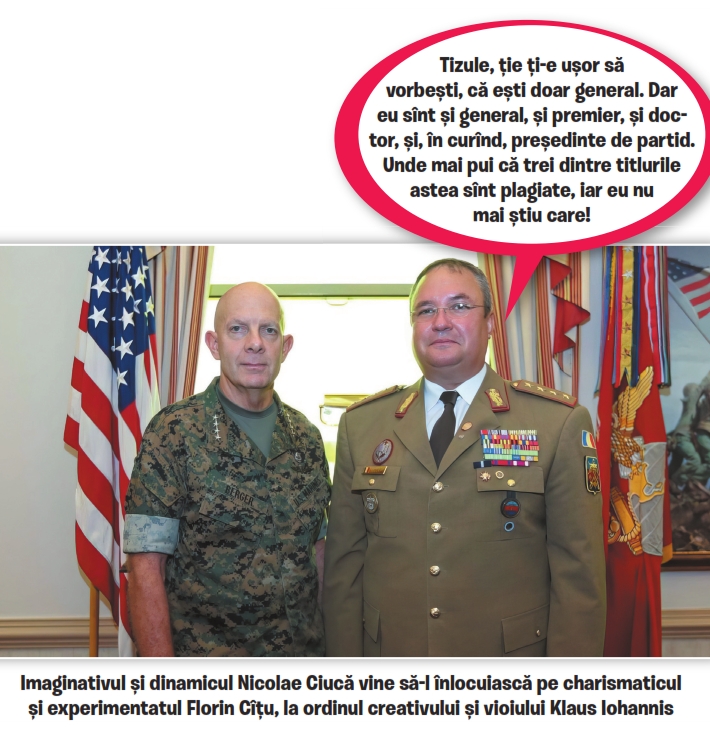 Mai e puțin, mai e un pic și Nicușor Ciucă va fi uns urmaș de Brătian și, cel mai probabil, candidat la președinția României din partea PNL. De ce tocmai Nicușor ajunge în această poziție? Păi, ne explică Alexandru Muraru, fratele geamăn al la fel de inteligentului Andrei Muraru, ambasadorul lui Klaus Iohannis în SUA: „Să fim sinceri: un om construit într-un sistem unde disciplina, ierarhia, valorile, onoarea, demnitatea sunt cele mai puternice arme este pregătit pentru lumea politică. Nicolae Ciucă este primul român după Regele Mihai decorat de SUA cu Legiunea de Merit, cea mai înaltă decorație pe care forțele armate ale SUA o pot acorda unei persoane care nu este cetățean american“. N-ajunge? Ar trebui să ajungă, să fie suficient ca încă de mâine să vă încolonați disciplinați, așteptând deschiderea urnelor de vot pentru prezidențiale, unde, evident, veți aplica ștampila cu „Să trăiți!“ direct pe numele generalului.