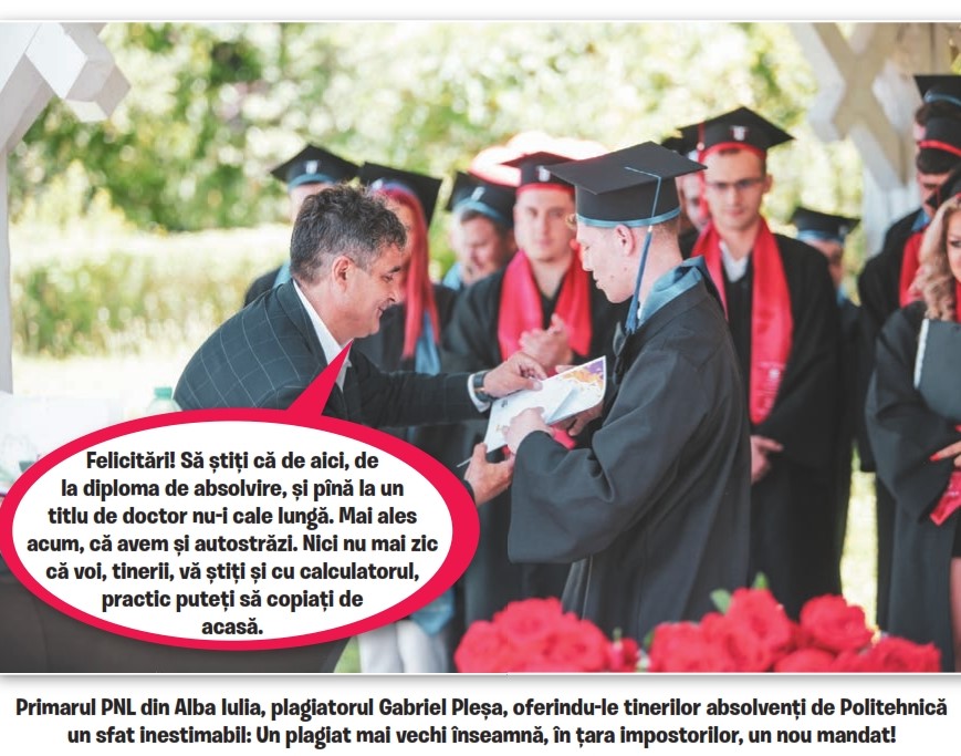 Ei bine, Gabriel Pleșa, că așa îl cheamă pe primarul ăsta plagiator și traseist, s-a înființat acum cîteva zile la UTCN, extensia din Alba Iulia, să le împartă diplome absolvenților și să le dea sfaturi de viață. Despre cum să facă, mai departe, dacă vor un doctorat, cum să conducă mulți kilometri și alte asemenea sfaturi unde, dovedit, are experiență. Evident, a fost invitat de conducerea UTCN, una căreia nu pare să-i pese de faptul că distinsul politician e un plagiator ordinar. De fapt, UTCN i-a și dat un job individului, Gabriel Pleșa fiind și cadru didactic, profesor universitar asociat, tocmai în baza acelui doctorat obținut cu un plagiat ordinar și dovedit. Că, deși n-a avut legătură cu educația, odată ajuns primar s-a făcut și puțin profesor, că așa îi șade bine unui impostor penelist.