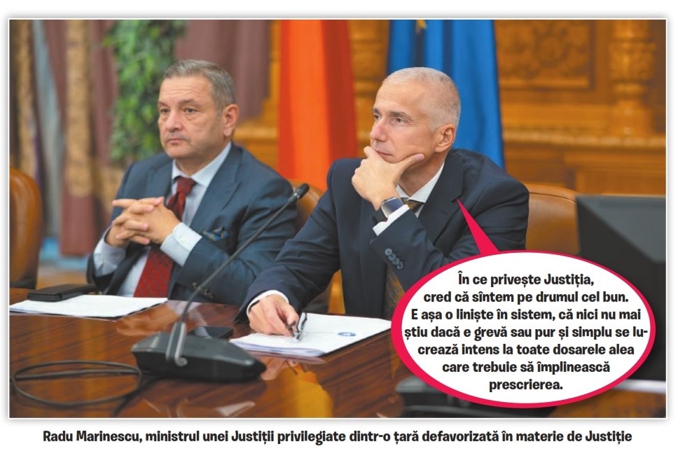 Nu doar că băiatul ăsta pare rupt de realitate, dar ai zice că omul conduce simultan toate ministerele Oceaniei, de la cel al Adevărului și până la cel al Abundenței. Marinescu pare să aibă nu doar coerența unui Călin Georgescu vorbind despre tunelurile energetice ori nano-cipurile din Pepsi, dar până și logica lui. Pe lângă multe truisme, Marinescu face și un fel de contorsionism logic, declarând că Ministerului Justiției îi revine rolul esențial de a întreprinde toate demersurile necesare pentru existența unui cadru legislativ eficient și coerent, care să permită identificarea rapidă și sancționarea cu fermitate a tuturor faptelor de corupție, admițând cumva că Parlamentul chiar este un fel de anexă în care se prepară comenzile venite de la Justiția, într-un veritabil quid pro quo ce presupune o Justiție oarbă în ce privește corupția și surdă la reformă. Și nu e tocmai o scăpare, căci omul își dublează absurditatea, spunând că prin inițiativele legislative pe care le promovăm, ne asigurăm că normele internaționale sunt transpuse corect în legislația națională, iar standardele europene și globale în materie de integritate sunt respectate.
