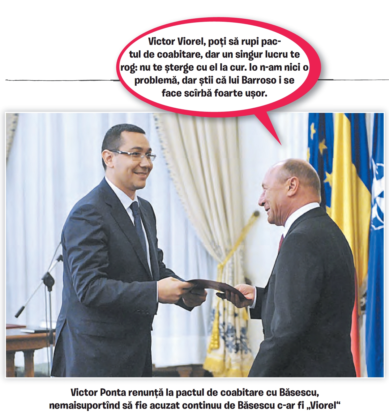 Candidata PMP la președinția României, Elena Udrea, a lansat o provocare la adresa premierului Ponta, pe care vrea să-l înfrunte în cadrul unui concurs televizat de bancuri chiar înainte de primul tur al alegerilor. „I-am propus lui Ponta să dezbatem programele noastre politice în fața întregulului popor, ca parte a unui concurs de bancuri prezentat de Andrei Duban“, a mărturisit Elena Udrea. „Românii au dreptul să știe ce-i așteaptă după ce venim la putere. De aceea, i-a spus premierului să-și umple tolba cu glume proaste, căci le voi avea și eu pe ale mele“, a conchis fosta blondă de la Cotroceni.