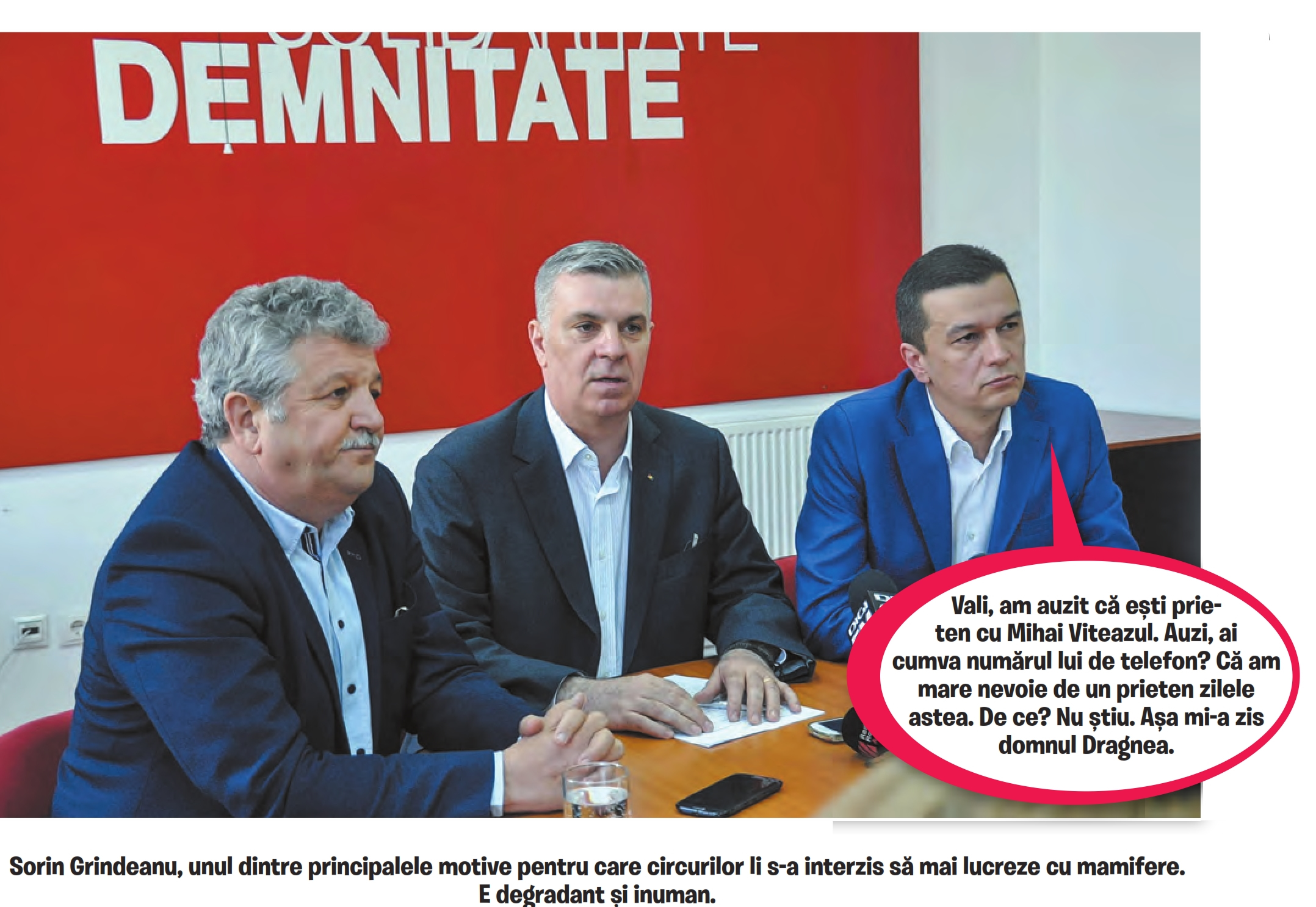“Eram în camera mea din Palatul Victoria, căutam noi metode prin care să putem transforma România în Grădina Maicii Domnului, cînd mă cheamă un băiat că vrea domnul Dragnea să vorbim în piață. Mă uit pe geam, afară foarte mulți protestatari. Mă, sigur-sigur m-a chemat domnu’ Dragnea? Da, sigur- sigur. Mă duc pînă la poartă, afară sute de mii de protestatari. Unde-i domnul Dragnea? Băiatul zice că-i în mijlocul mulțimii. Sigur-sigur? Da, sigur-sigur! Mă duc în mijlocul mulțimii, nu-l găsesc pe domnul Dragnea, mă îngrijorez, poate a pățit ceva, cu toți huliganii ăștia. Băiatul îmi zice că tocmai a plecat domnul Dragnea, dar mi-a lăsat pancarta asta și a zis să scandez împotriva guvernului. Și uite-așa am luat pancarta și-am început să scandez «Jos guvernul!» și multe altele lucruri rușinoase pe care mi-e și rușine să le menționez, dar dacă așa se cere, așa mă execut. Că de-aia sînt executivul!”