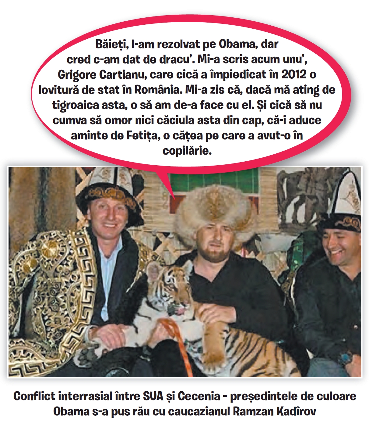 Am văzut pe Internet niște poze cu Ramzan Kadîrov. Purta o haină extravagantă de blană, era înconjurat de mașini luxoase și ținea în brațe un tigru alb. Nu pot să nu recunosc că m-a cuprins invidia. Uneori mi-aș dori să fiu și eu alb.