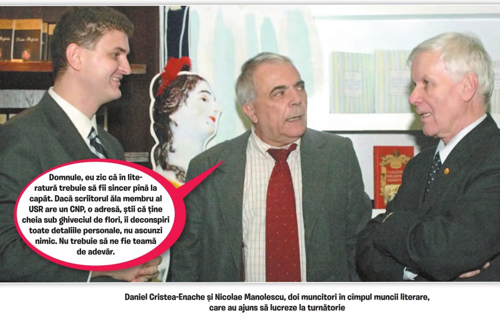 Uniunea Criticilor Literari din România, cunoscută în mod impropriu drept Uniunea Scriitorilor și strâns unită în jurul lui Nicolae Manolescu, se află, de luni bune, într-un război dăunător și absurd cu o parte a scriitorilor deloc nereprezentativi ai României. Iar totul a început de la faptul că unii nu pot înțelege când le sună insistent deșteptătorul retragerii demne. Din criticul-etalon care era, autor competent al unei istorii a literaturii care-i va chinui, probabil, pe copiii noștri așa cum ne-a chinuit Călinescu pe noi, Nicolae Manolescu s-a transformat într-un om care se cramponează de funcții și încalcă pe bandă rulantă principii. Mai nou, statute și legi.