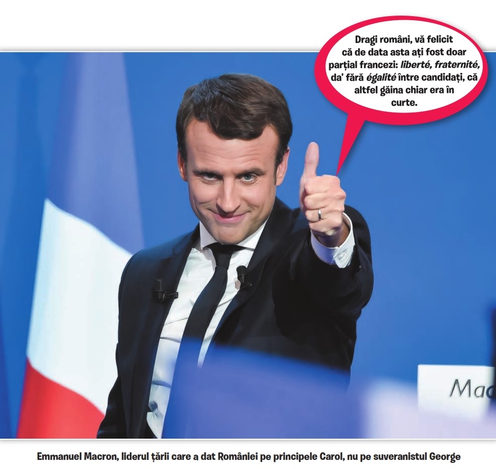 Emmanuel Macron (leo prezidan, nu leo prezisimion): „Dragă George, știu că te afli într-o situație delicată, dar trebuie să le dau dreptate jurnaliștilor din țara mea: nu te voi primi prea curînd la Élysée, oricît ai aplica la postul de badantă pentru nevastă-mea.“