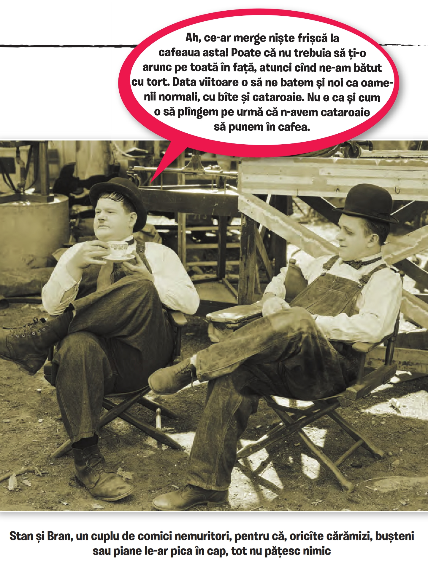 Sunt oameni care pur și simplu nu înțeleg umorul. Stan și Bran, de exemplu. Ați observat că nu râdeau niciodată, deși treceau prin întâmplări foarte amuzante, care mie îmi provocau hazul într-un mod plăcut? Nici maestrul Dem. Rădulescu nu râdea, deși spunea niște anecdote inedite demne de un comic intergalactic. E clar că oamenii ăștia nu aveau pic de umor, deși lucrau în comedie. Nu erau capabili să-și aprecieze nici măcar propriile glume, d-apăi pe-ale altora.