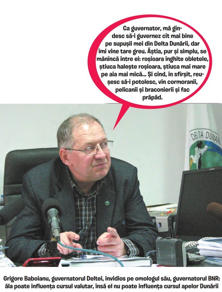 La Administrația Rezervației Biosferei Delta Dunării, de exemplu, consiliul științific, cel care îndrumă și supraveghează activitatea ARBDD, n-a mai ținut pasul cu modificările din teren. Așa se face că fostul guvernator, Lucian Simion, îndepărtat din funcție de către premierul Cioloș pe motiv de candidatură la Primăria Tulcea, a rămas membru al consiliului științific, ocupînd locul guvernatorului actual, Grigore Baboianu. E drept, ministrul Mediului are preocupări mult mai importante decît să facă funcțională la întreaga capacitate cea mai mare rezervație naturală a României și, în plus, cine știe cu adevărat care va fi rezultatul alegerilor? Dacă fostul guvernator va redeveni guvernator din primele luni ale anului viitor? Ce rost mai are să tipărim un nou ordin de ministru pentru un nou consiliu științific? N-ar fi asta o dovadă că nu respectăm natura? Păi, se poate?