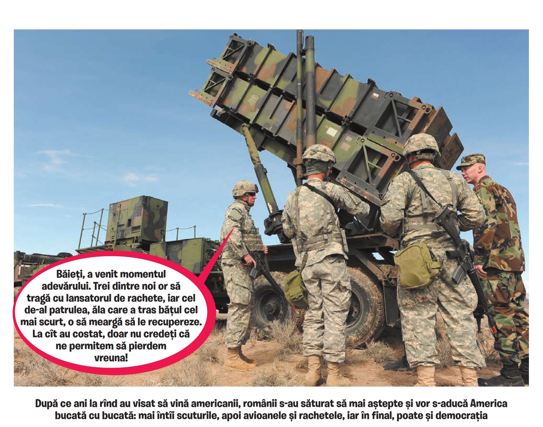 Scandal de proporții în cadrul Ministerului Apărării Naționale după ce s-a descoperit că majoritatea rachetelor Patriot achiziționate de la partenerii noștri americani sînt de unică folosință, avînd atașate un sistem ingenios de autodistrugere imediat ce își ating ținta.