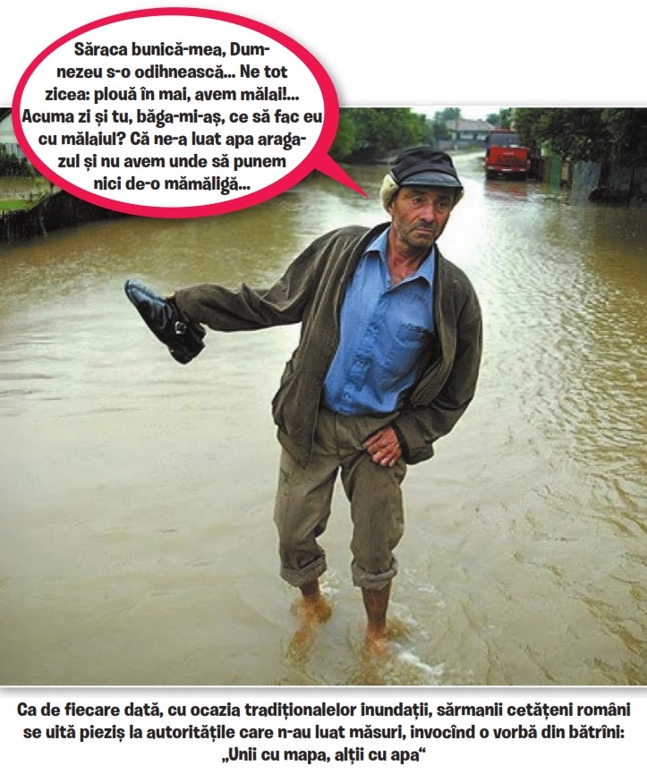 Ca la fiecare inundație, reporterii au făcut coadă la cea mai adâncă baltă, în care s-au vârât să transmită în direct că „și în acest an, apa a luat oamenilor agoniseala de o viață!“; mai mulți reporteri luați de val au fost găsiți în aval, la un bufet comunal.
