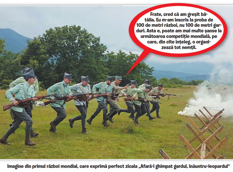 Pacea de la București. Germania, cu mustățile întoarse victorios în sus, a pus documentul pe masă și așteaptă o simplă formalitate din partea României. România însă ba nu-și găsește pixul, ba s-a terminat pasta, ba n-are ochelarii de scris, ci numai pe ăia de citit…