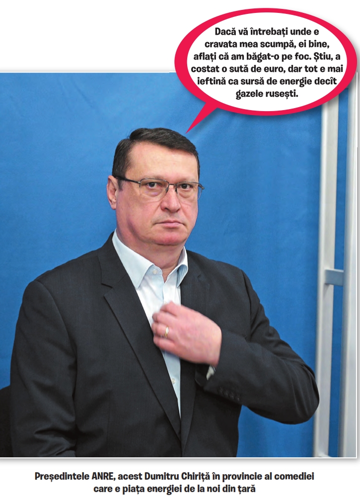 Șeful ANRE, Dumitru Chiriță, e România în sine. Individul rezumă o epocă, o istorie, pune capac unui dezastru, rezumă o dizgrațioasă decădere. Dumitru Chiriță nu are studii legate de domeniu, câștigă aproape 12.000 de euro pe lună și îl doare fix la carici de ce ar spune oricine. O criză a energiei cum nu s-a văzut în ultimii treizeci de ani, iar șeful ANRE tace. Iohannis pare un monument de bun-simț pe lângă acest Chiriță. Iohannis pare idealul de comunicare pe lângă acest nene, e empatia întruchipată.