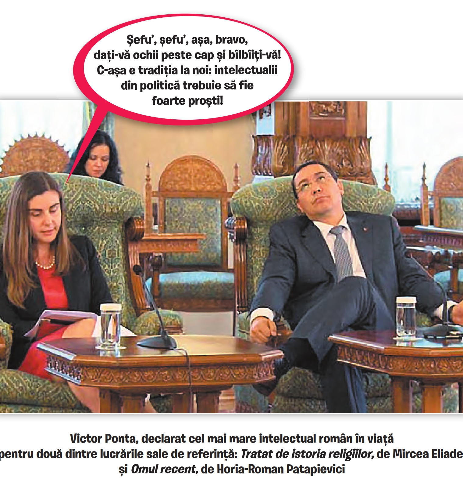 Ce e mai stupid decât să iei în serios un sondaj din care Victor Ponta iese cel mai intelectual? Unii s-au tăvălit de parcă se dăduse o decizie judecătorească prin care se stabilea că prietenia cu Ponta e una fără beneficii. Alții au comentat ce “înseamnă” asta. Ion Cristoiu, spre exmplu, a văzut un bun prilej să-și mai taie câteva felii din paranoia și s-o arunce vulgului înfometat de analiză: “Cred că sondajul arată popularitatea lui Victor Ponta. Totul se raportează la acea guvernare a lui. Este vorba de o întrebare deschisă, înseamnă că a fost o mișcare prin care, în numele intelectualului, oamenii s-au pronunțat în legătură cu politicienii. Faptul că el a fost pe primul loc ar trebui să îi dea de gândit și lui Klaus Iohannis, și lui Dacian Cioloș”. Aa, deci despre asta e vorba, nu despre faptul că IRES face un sondaj stupid, iar niște mulți imbecili îi plasează pe primele trei locuri la intelectuali pe Victor Ponta, Corneliu Vadim Tudor și Klaus Iohannis. Un dispărut, un mort și un mut.